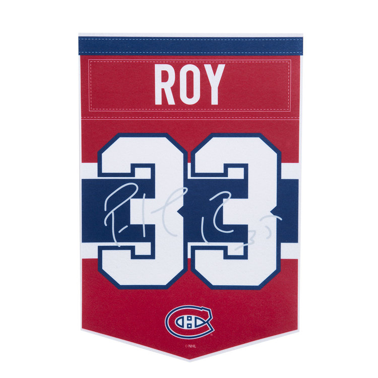 Célébrez l'héritage de l'un des plus grands joueurs des Canadiens avec la bannière miniature avec signature réplique du #33 Patrick Roy. Cette mini-bannière haut de gamme rend hommage à "Saint Patrick" et à sa carrière légendaire avec les Canadiens de Montréal. Arborant le #33 iconique de Patrick Roy et une réplique de sa signature, cette pièce de collection est parfaite pour tout fan voulant honorer la légende du hockey.