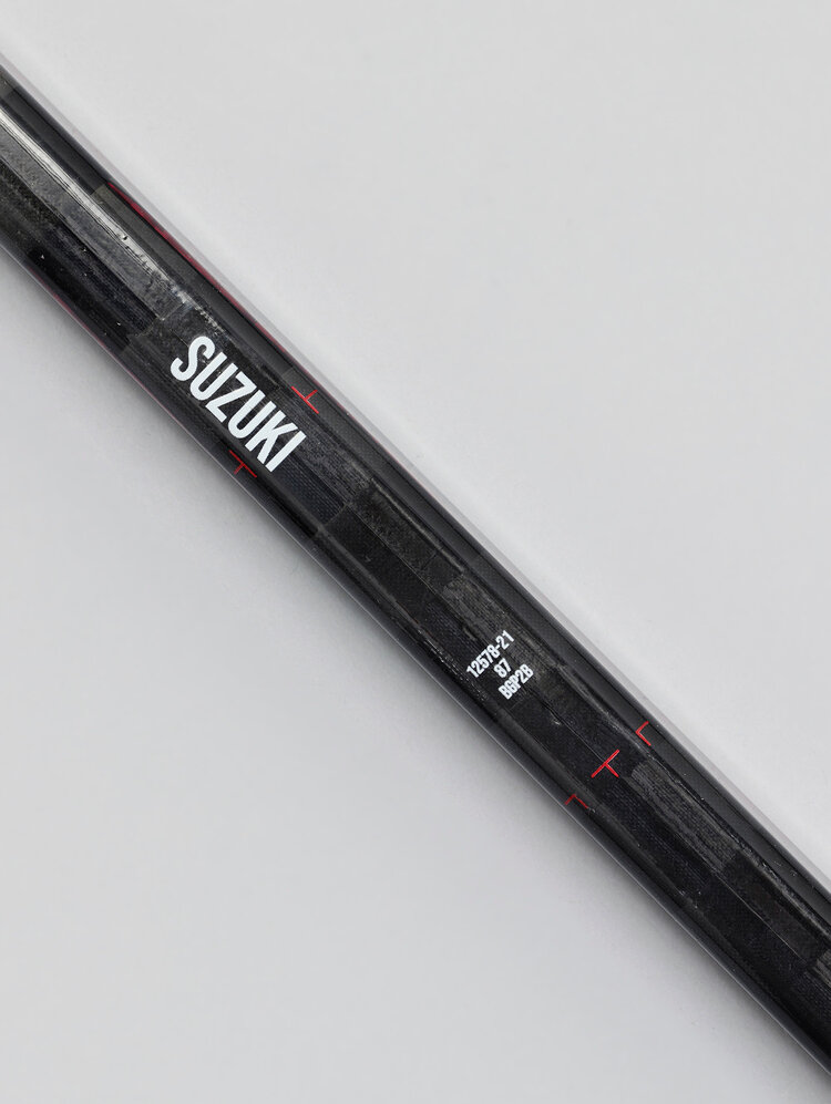 Ceci est un bâton droitier Bauer Twitch Pro en rouge avec 87 de flex utilisé par Nick Suzuki.