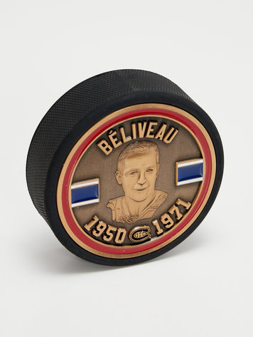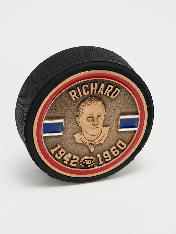 Rondelle de collection du légendaire numéro 9 des Canadiens de Montréal, Maurice Richard. La rondelle prends la forme d'un médaillon a l'éffigie de Richard avec son buste au centre, son nom au dessus et les années qu'il a été actif.