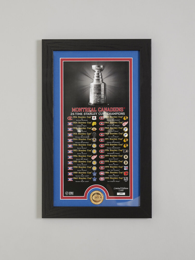 Une édition limitée commémorant les Canadiens de Montréal, 24 fois champions de la Coupe Stanley! Ce cadre de 12 po x 20 po avec double passe-partout et panneau frontal en verre comprend une photo commémorative personnalisée et numérotée individuellement de 15 po x 7 po énumérant chacune de leurs coupes Stanley et une pièce commémorative de l'équipe en bronze massif de 39 mm frappée. Chaque photo est numérotée à la main dans une édition limitée à 5 000 exemplaires et chaque cadre est accompagné d'un certificat d'authenticité. Cet article est sous licence officielle de la LNH et est fièrement fabriqué aux États-Unis par The Highland Mint.