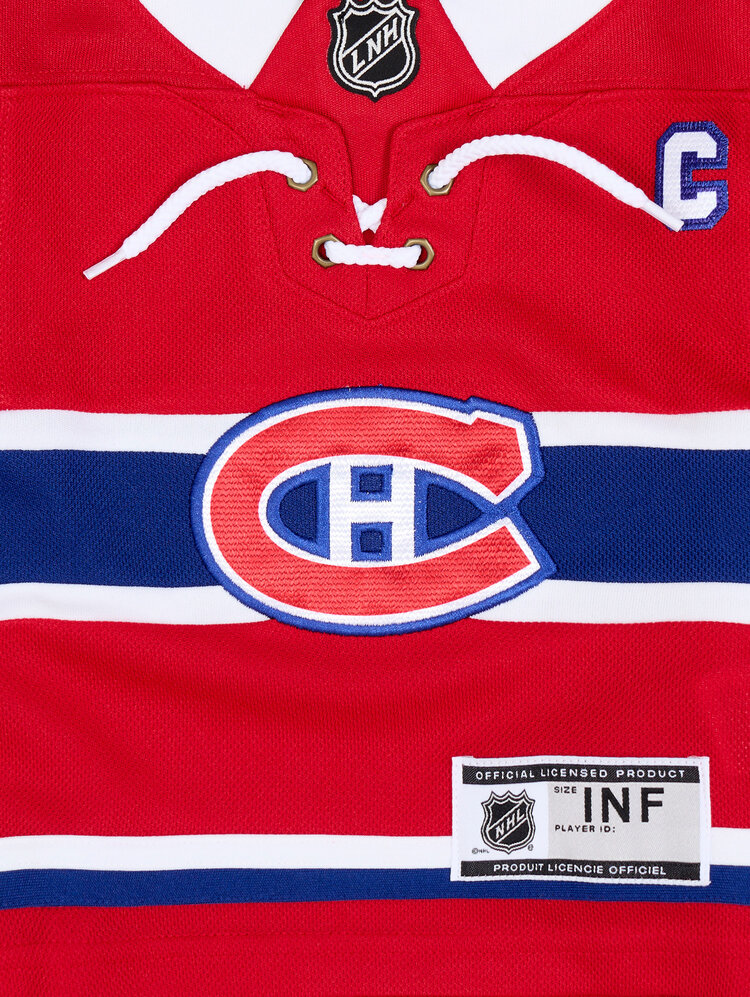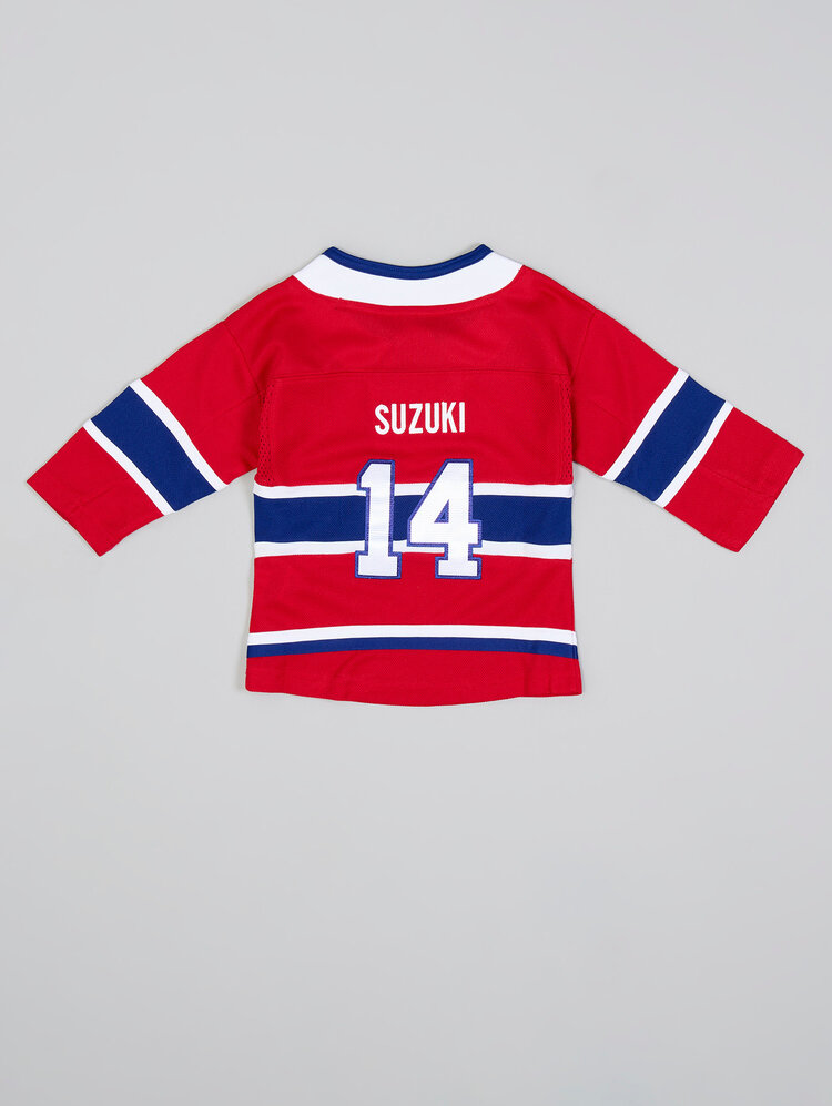 Ce chandail pour bébés est le chandail officiel des Canadiens de Montréal à Domicile avec le nom Suzuki #14 et le C collé pro sur le chandail.