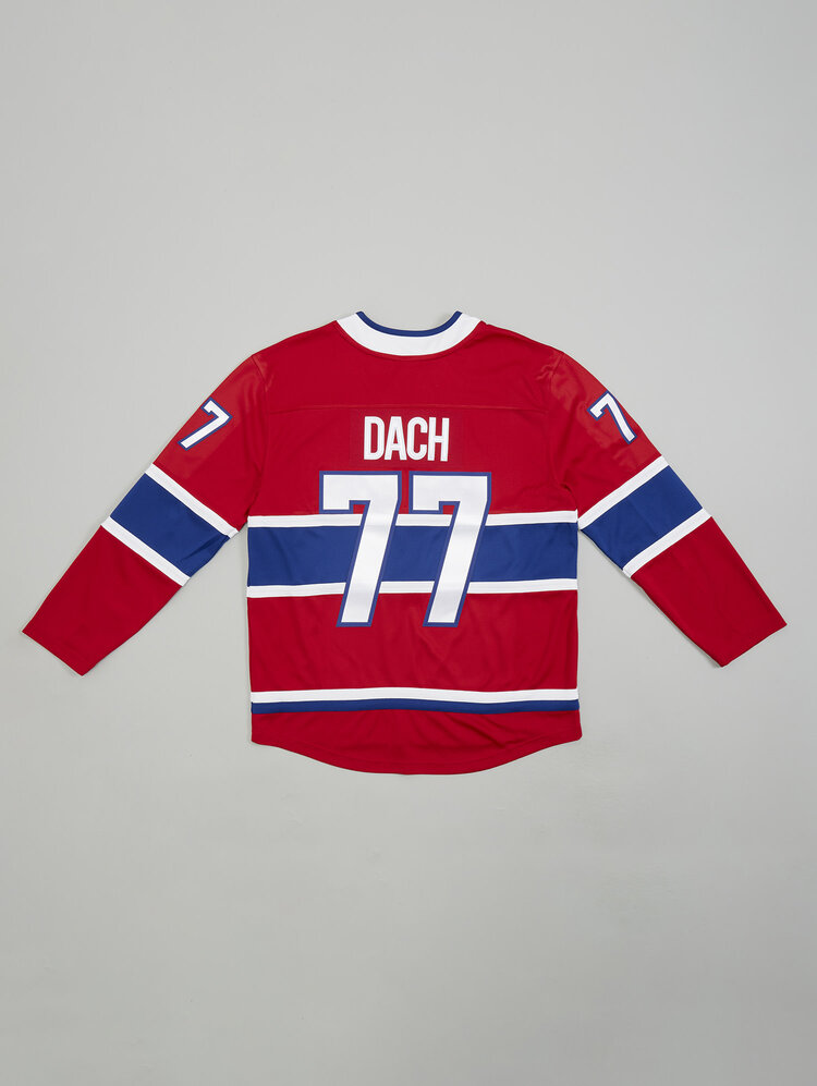 Fabriqué en polyester durable et respirant, ce chandail est conçu pour le confort, que vous regardiez le match à l'aréna ou que vous représentiez votre équipe partout où vous allez. Le devant affiche fièrement le logo " CH " des Canadiens de Montréal, méticuleusement collé au centre, tandis que les manches et les épaules sont ornées de bandes bleues et blanches audacieuses qui mettent en valeur le schéma de couleurs traditionnel de l'équipe. Le nom et le numéro de Dach (#77) sont affichés en évidence au dos, en grandes lettres et chiffres, pour démontrer votre soutien à l'un des meilleurs jeunes joueurs des Canadiens.