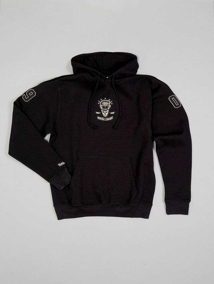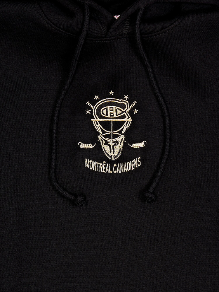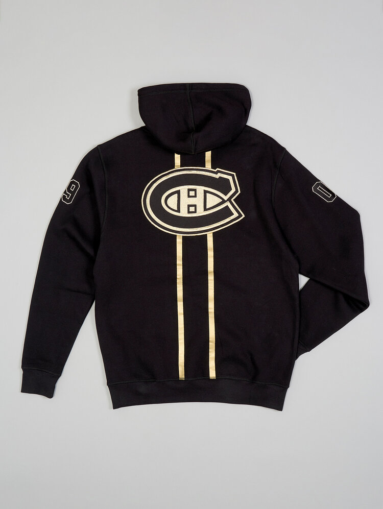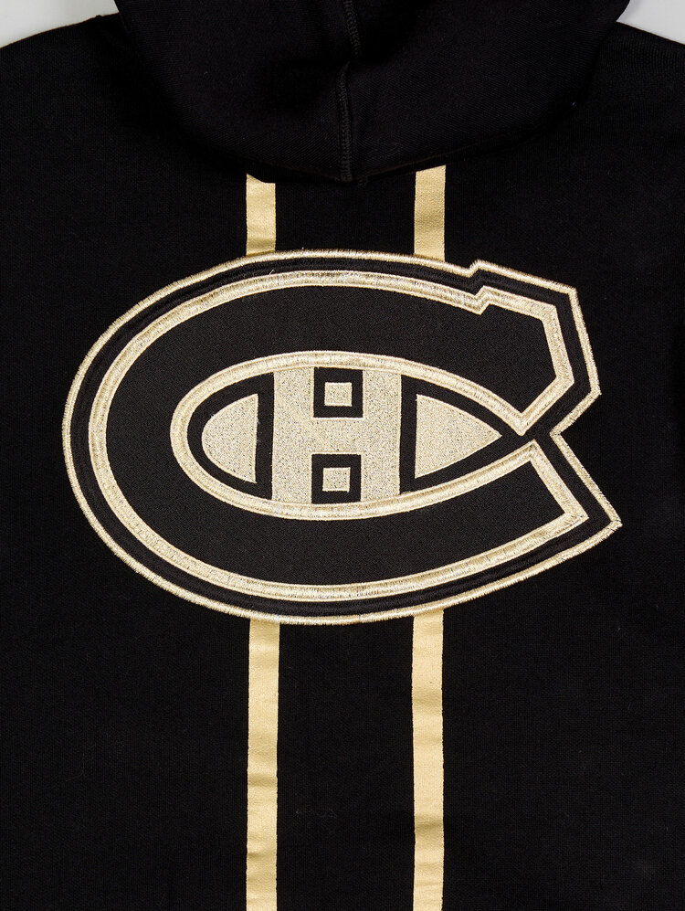 Affichez votre passion pour le CH avec style grâce au ouaté à capuchon Golden Goalie des Canadiens de Montréal. Ce ouaté noir haut de gamme présente un motif brodé saisissant d’un masque de gardien avec bâtons croisés et étoiles à l’avant, accompagné de l’inscription “Montreal Canadiens” pour un look authentique. À l’arrière, un grand logo des Canadiens rehaussé de détails dorés et deux bandes verticales dorées apportent une touche unique et audacieuse. Complété par des numéros brodés sur les manches, une poche avant spacieuse et un capuchon ajustable avec cordons, ce chandail est idéal pour les partisans qui recherchent confort et style affirmé.