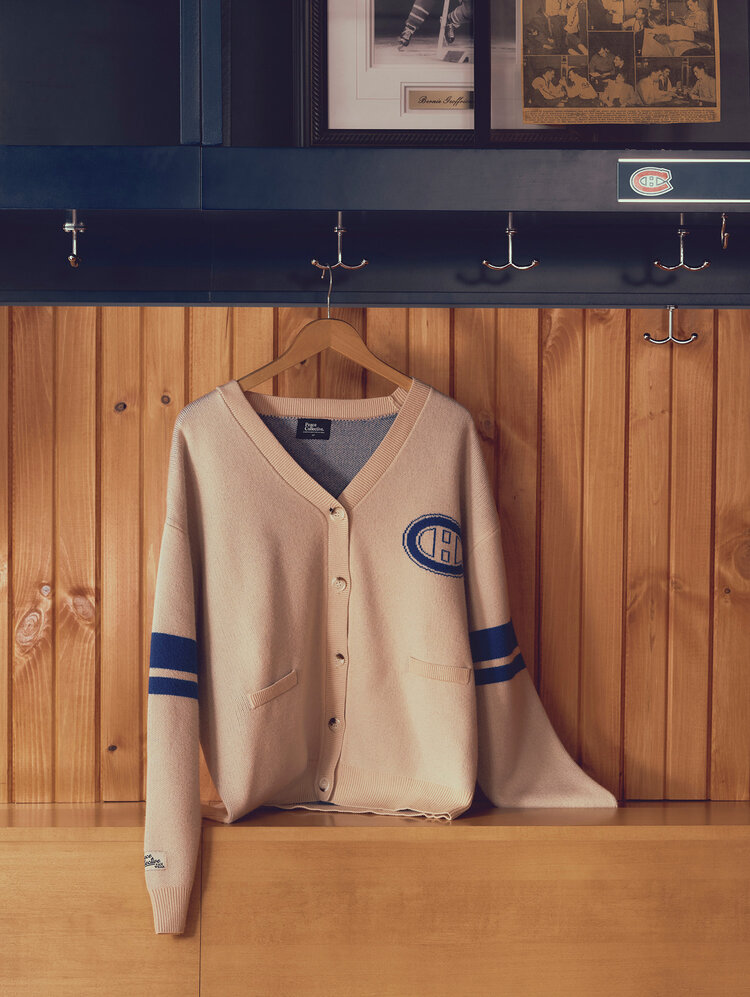 Ajoutez une touche intemporelle à votre garde-robe de partisan avec ce cardigan tricoté à logo classique des Canadiens de Montréal. Ce modèle beige est rehaussé d’accents bleus, notamment des rayures sur les manches et des détails côtelés, pour un look vintage et sportif. Le logo emblématique des Canadiens est brodé sur la poitrine, affichant votre fierté d’équipe avec élégance. Doté d’un col en V et d’une fermeture à boutons, ce cardigan offre chaleur, confort et polyvalence — idéal pour les jours de match ou les sorties décontractées. Les deux poches avant ajoutent une touche pratique à ce vêtement incontournable.