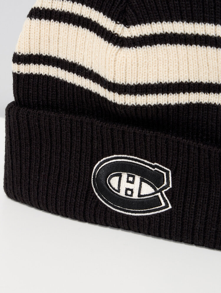 Restez au chaud avec style grâce à la tuque rayée noir et blanc des Canadiens de Montréal. Confectionnée en fil acrylique chiné à 100 %, elle allie confort et durabilité. Son revers orné de rayures couleur grès apporte une touche raffinée à son design monochrome, tandis que son élasticité assure un ajustement confortable et adaptable tout au long de la journée. Arborant fièrement un logo brodé en relief bicolore des Canadiens à l’avant, c’est l’accessoire idéal pour afficher votre fierté envers l’équipe avec élégance.