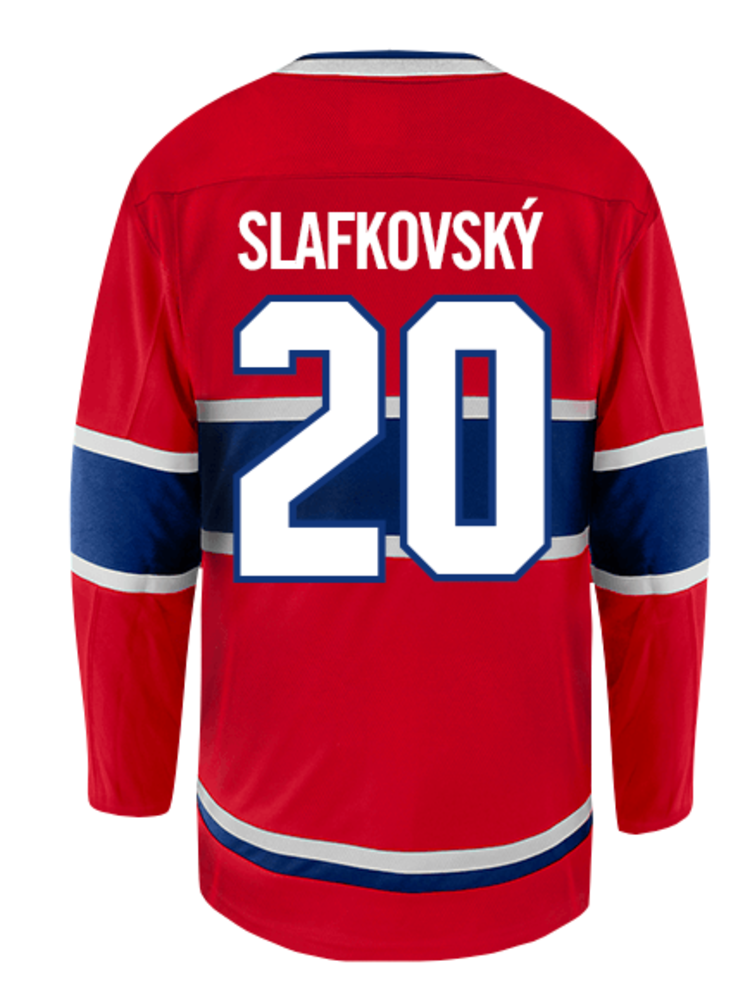 Ce chandail pour enfant 7 à 14 ans est le chandail officiel des Canadiens de Montréal à Domicile avec le nom Slafkovsky #60 collé sur le chandail.