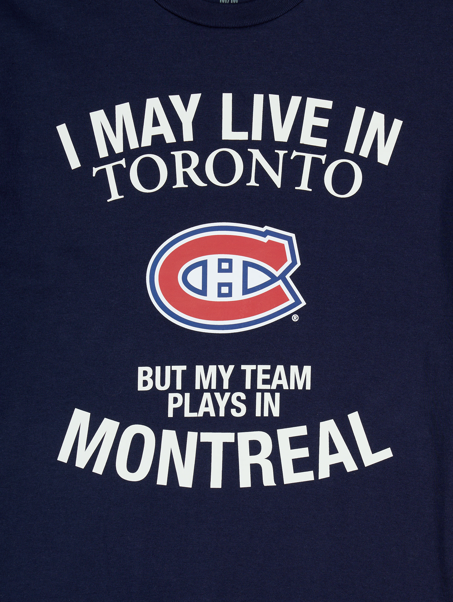 Affichez vos vraies couleurs peu importe où vous habitez avec le T-shirt Canadiens de Montréal “I May Live in Toronto”. Conçu pour les partisans du CH établis en territoire rival, ce t-shirt bleu marine met de l’avant l’emblématique logo des Canadiens ainsi que le message : « Je vis peut-être à Toronto, mais mon équipe joue à Montréal. »