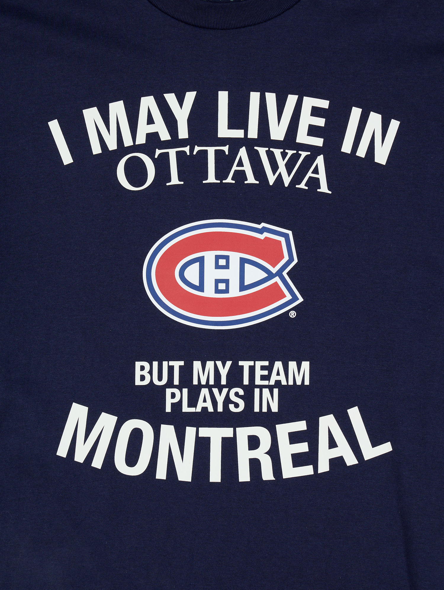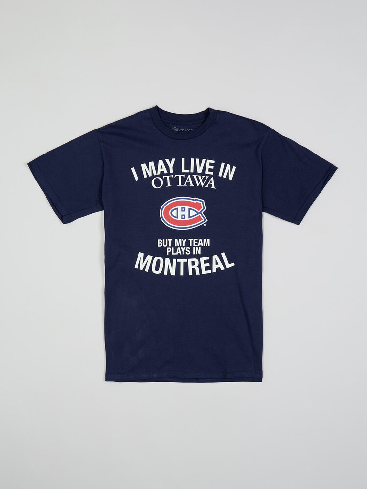 Affichez vos vraies couleurs peu importe où vous habitez avec le T-shirt Canadiens de Montréal “I May Live in Toronto”. Conçu pour les partisans du CH établis en territoire rival, ce t-shirt bleu marine met de l’avant l’emblématique logo des Canadiens ainsi que le message : « Je vis peut-être à Ottawa, mais mon équipe joue à Montréal. »