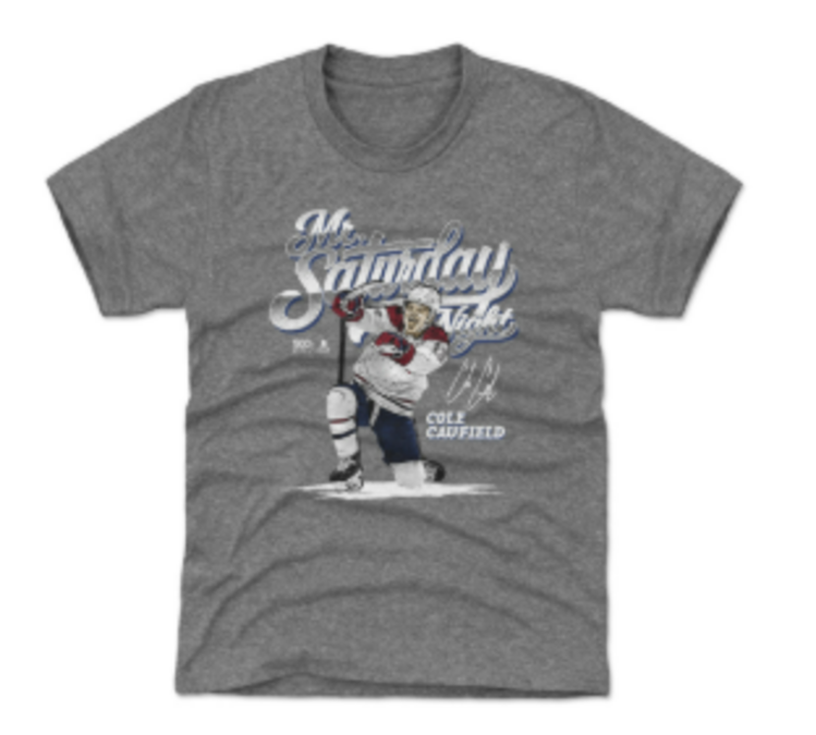Faites briller la passion des jeunes partisans avec le t‑shirt joueur junior de Cole Caufield – « Mr. Saturday Night ». Ce t‑shirt gris chiné met en vedette un visuel percutant de Cole Caufield en pleine action, accompagné de son surnom emblématique et de son nom, pour un look électrisant les jours de match. Conçu pour le confort et le port quotidien, ce t‑shirt à manches courtes offre une coupe jeunesse classique idéale pour regarder les matchs, jouer au hockey de rue ou afficher fièrement ses couleurs à l’école. Incontournable pour les jeunes fans des Canadiens de Montréal, ce t‑shirt de Cole Caufield allie style, énergie et fierté d’encourager l’un des joueurs les plus appréciés de l’équipe.