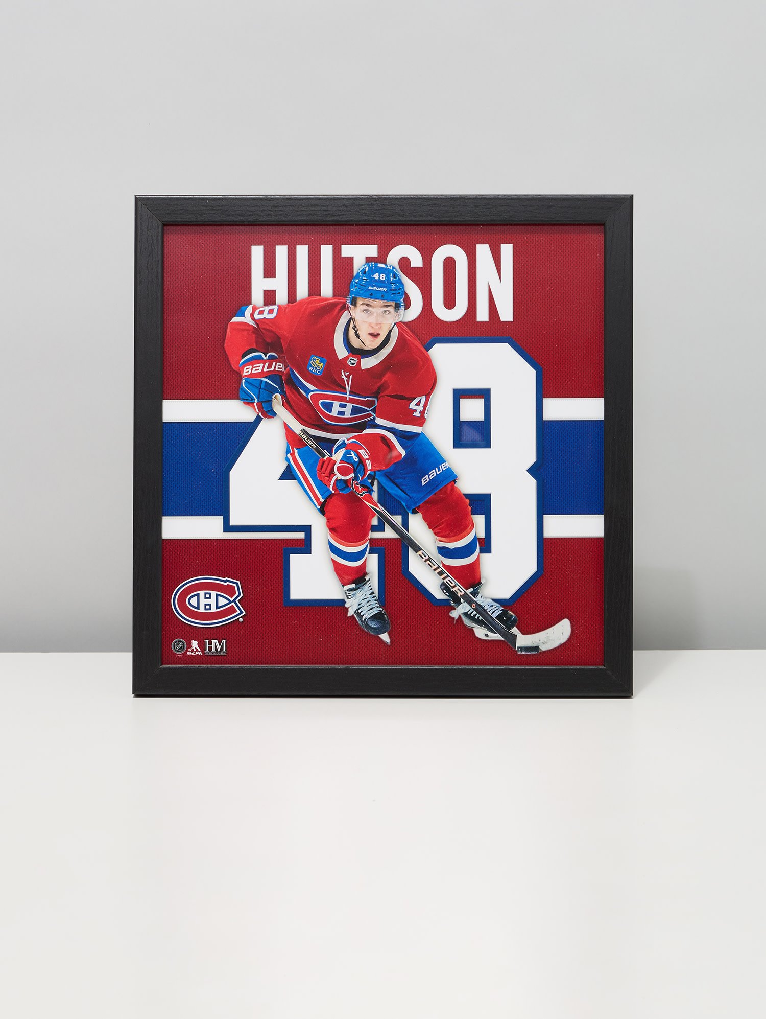 This unique collectible frame features an action photo of the Montreal Canadiens superstar defenseman, Lane Hutson, super imposed on his respective jersey number. The printed art is delivered in a 13 x 13 wood frame under glass and ready to hang. Officially Licensed by the NHL and NHLPA.