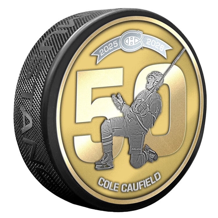 Celebrate a milestone moment in Montreal Canadiens history with the Cole Caufield 50th Goal Celebration Medallion Puck. This premium collectible puck commemorates Cole Caufield’s 50th career goal with a striking full‑color medallion design featuring a dynamic player image set against a bold gold backdrop.
