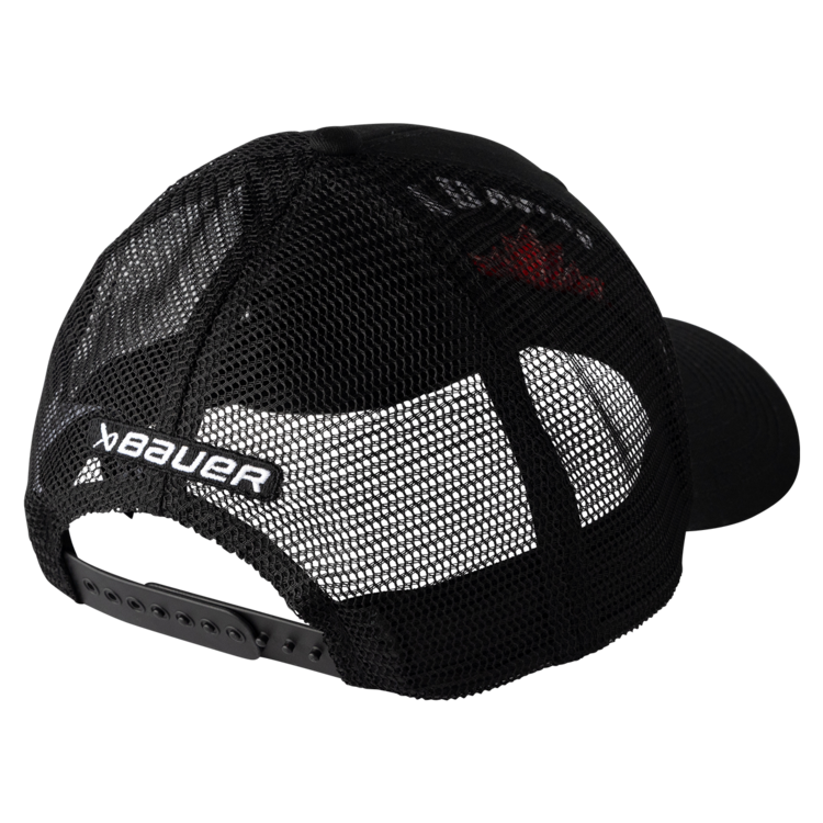 Featuring perforated back and side panels for superior breathability, this hat ensures maximum airflow during intense activities. The adjustable hook-and-loop closure delivers a customizable fit for all-day comfort. Highlighted by an embroidered maple leaf on the front, the hat proudly displays Canadian heritage, complemented by the BAUER lockup embroidered on the back and the official Hockey Canada® clip label.