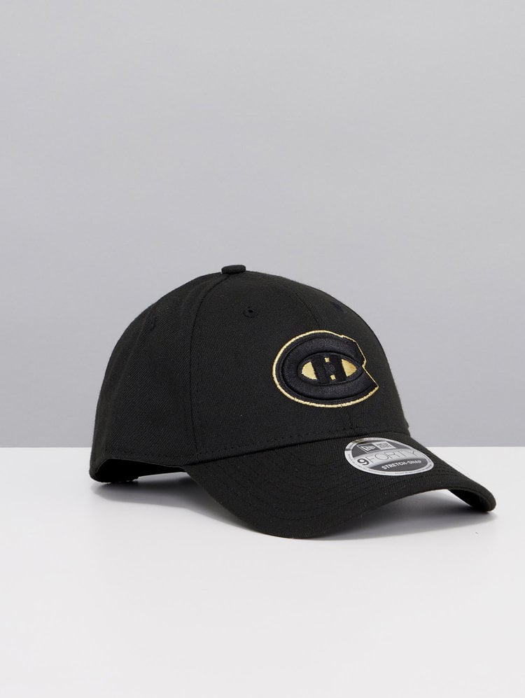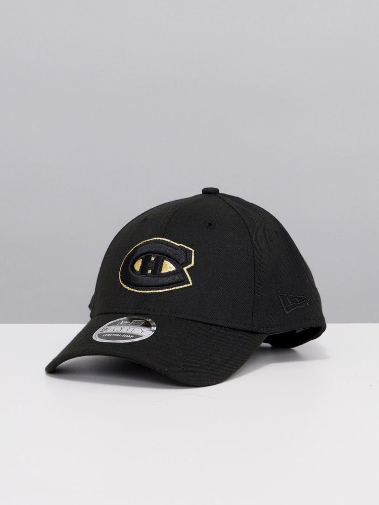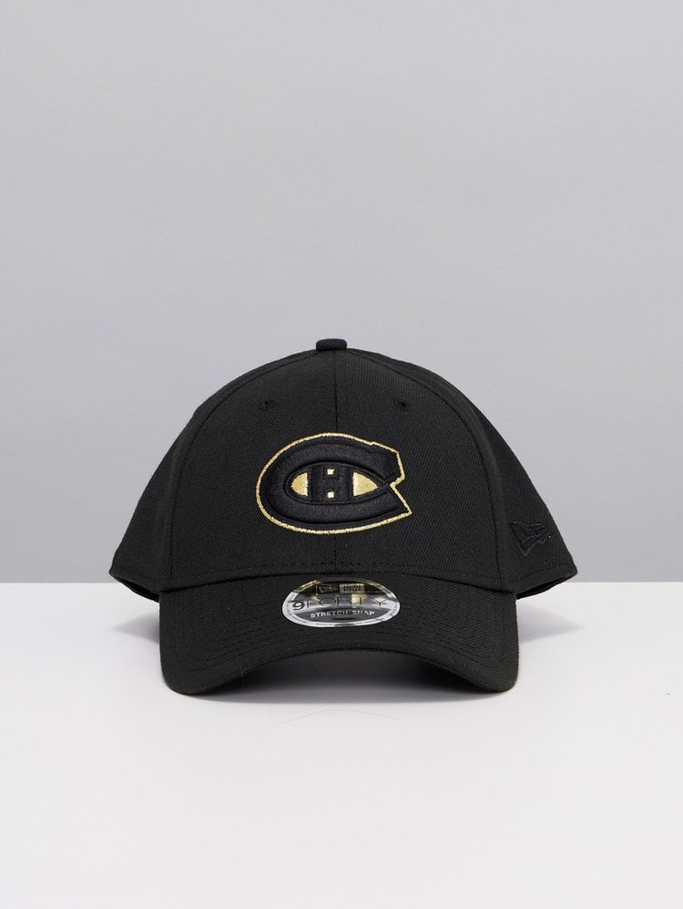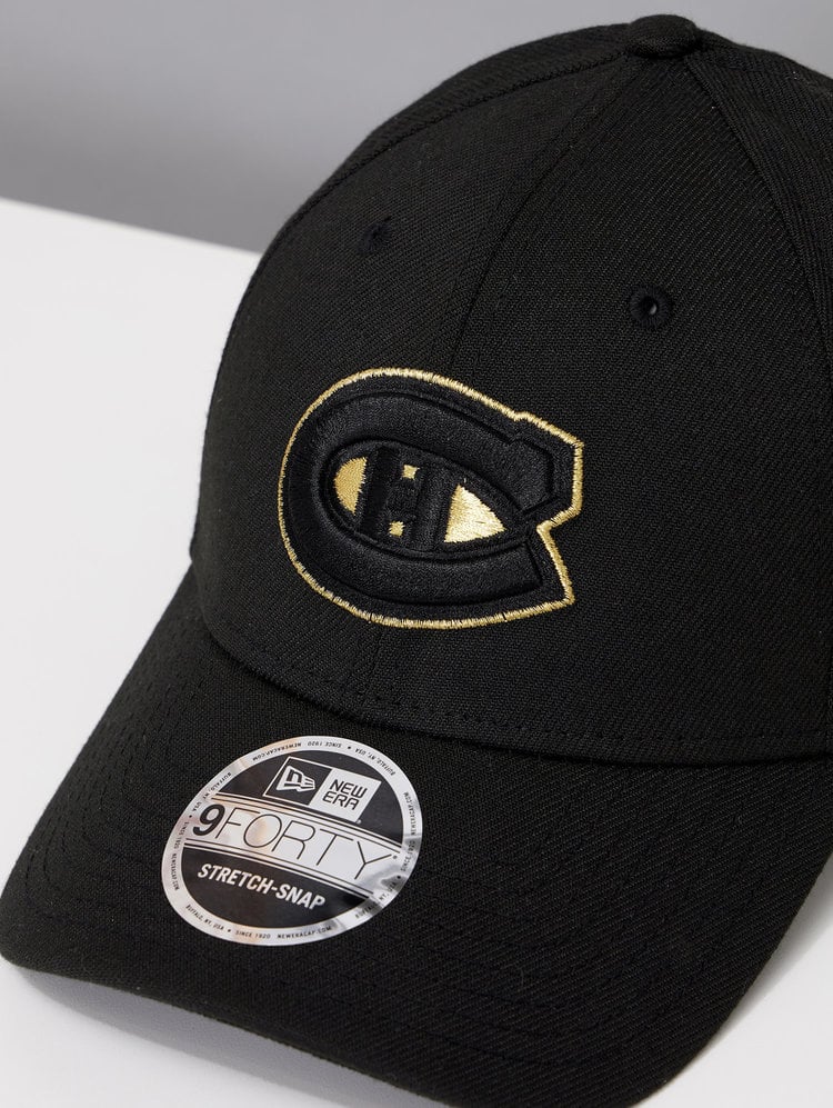 Montreal Canadiens 9FORTY Black & Gold Cap with embroidered Canadiens logo embroidered on the front in black and gold, the classic new Era logo embroidered on the side in black and a snapback adjustment at the back.