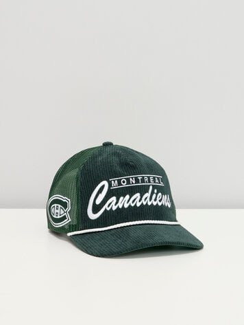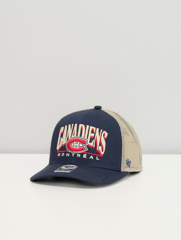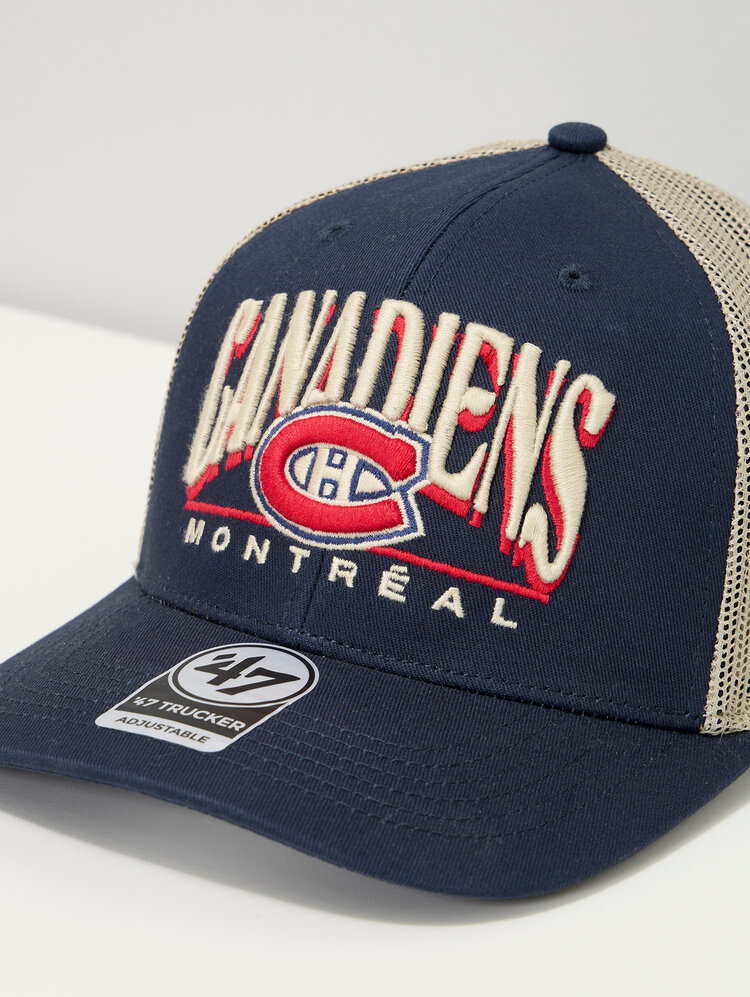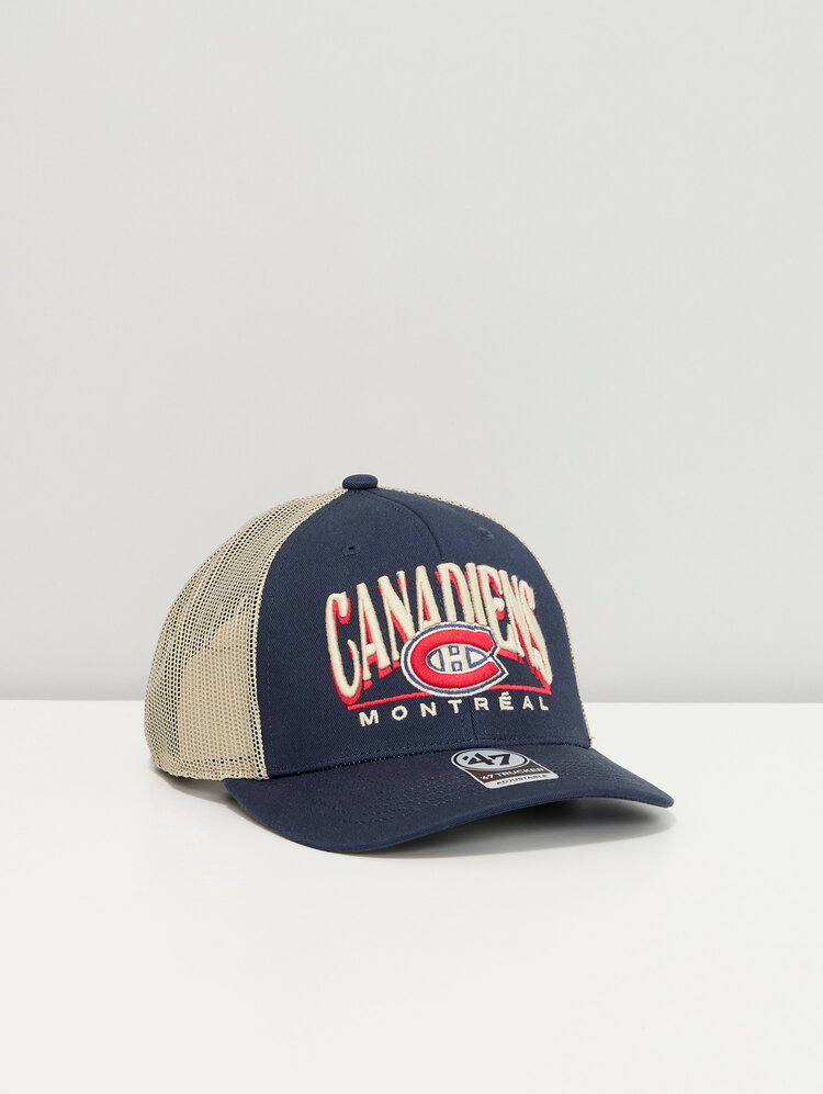 Stay cool and show your team pride with the Montreal Canadiens Arid Trucker Snapback Cap. Featuring a cotton twill front and a durable dark khaki polyester mesh back, this cap combines breathability with rugged style. Its structured shape and plastic snapback closure offer a secure and adjustable fit. The front showcases a bold raised and flat embroidered graphic with “CANADIENS MONTREAL” and the team logo, making it a standout piece for fans who appreciate both comfort and character.