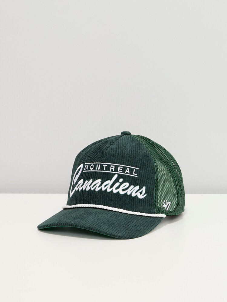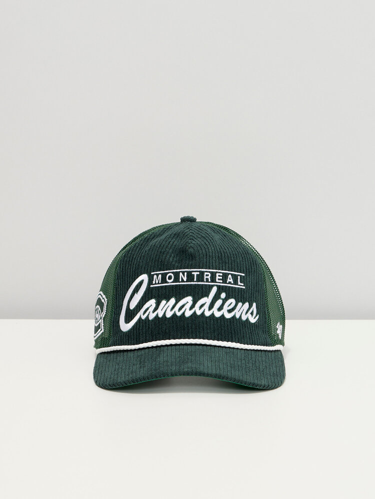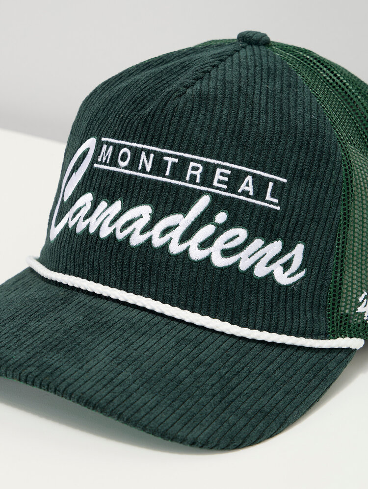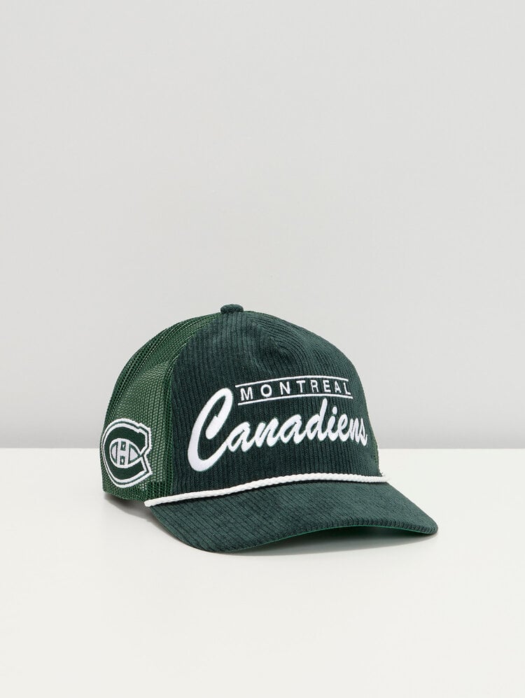 Bring retro flair to your fan gear with the Montreal Canadiens Double Header Rope Trucker Cap. Featuring an 8W corduroy front and a durable hard mesh back, this cap offers a relaxed fit and breathable comfort. The adjustable plastic snapback closure ensures a secure and customizable fit. A raised embroidered graphic on the front boldly displays “Montreal Canadiens,” while the side features a flat embroidered team logo. Finished with a braided rope detail across the front panel, this cap blends vintage style with modern fan pride.