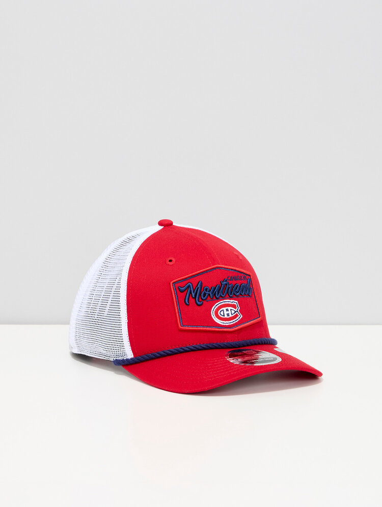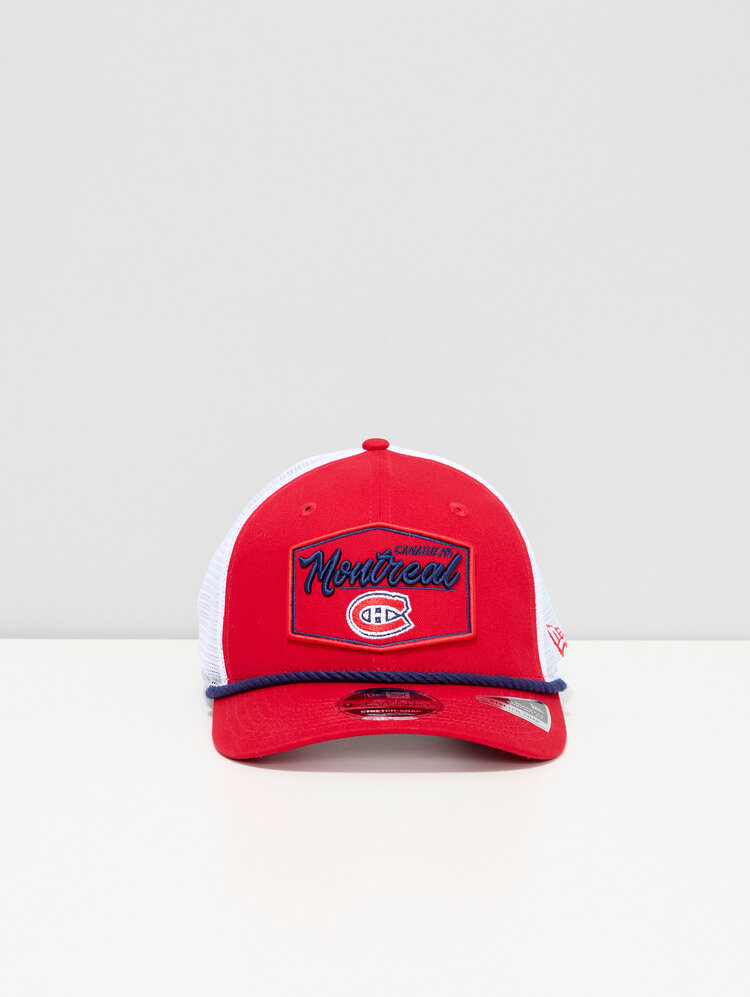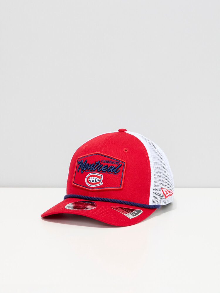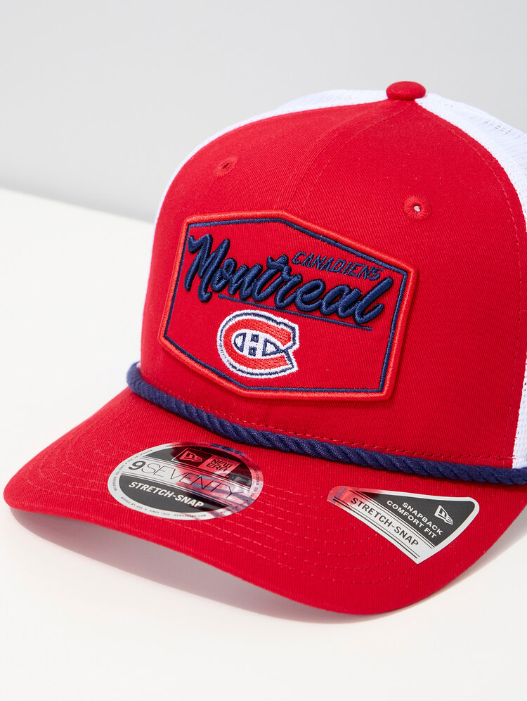 Hit the links in style with the Montreal Canadiens 9SEVENTY Rope Golf Trucker Cap by New Era. Featuring a bold red front panel and brim, this cap is designed with a breathable white mesh back and a distinctive blue rope detail across the crown. The embroidered "Montreal" script and Canadiens logo patch on the front add a vintage-inspired flair. With its adjustable snapback closure, this cap offers a comfortable, custom fit—perfect for showcasing your team pride on and off the course.