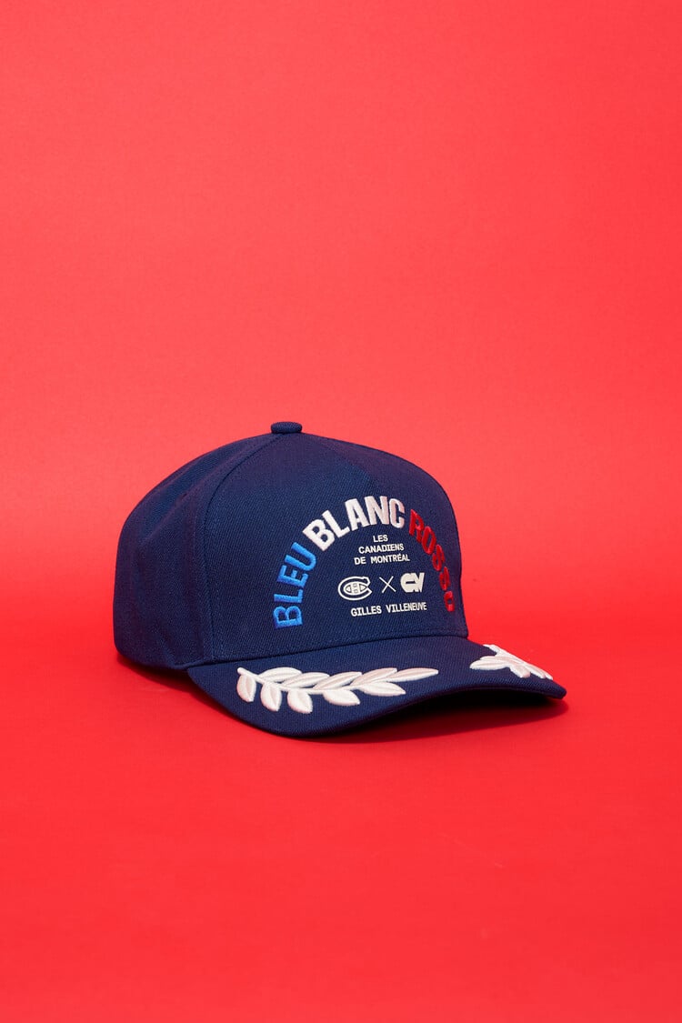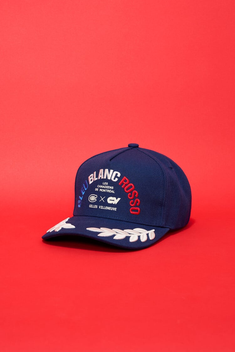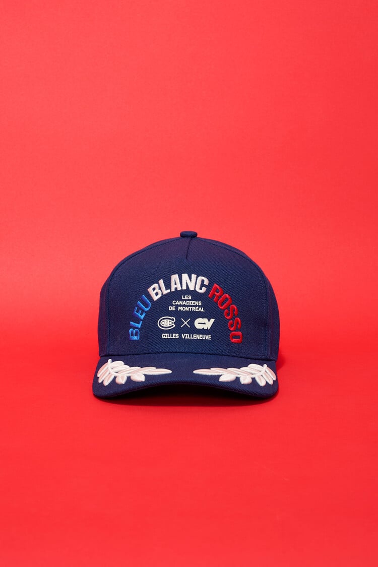 Crafted from durable, breathable materials, this navy cap delivers everyday comfort with a structured fit. The front features the bold “Bleu Blanc Rosso” arc graphic in gradient blue, white, and red, paired with official CH x GV branding for an unmistakably Montréal look. Embroidered laurel detailing on the visor adds a refined motorsport touch inspired by podium tradition.