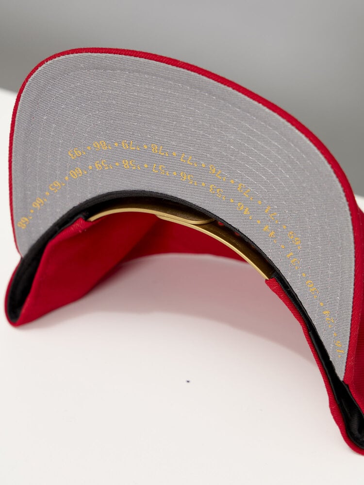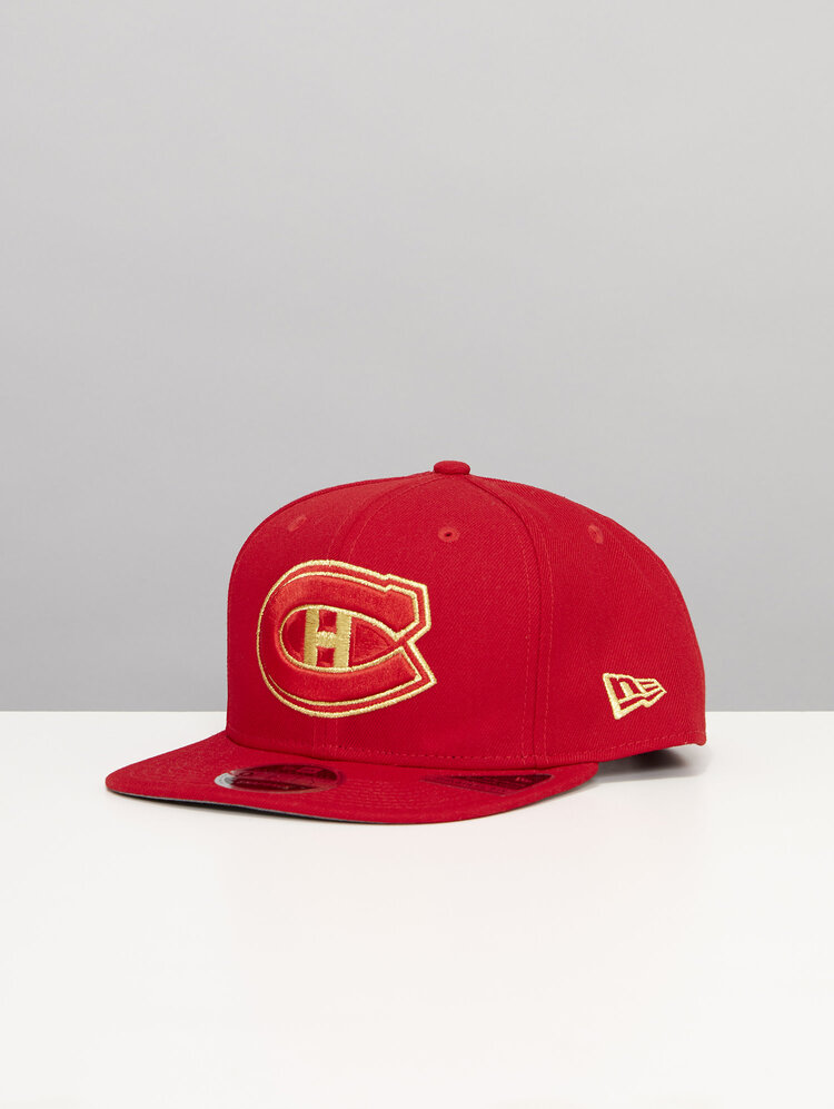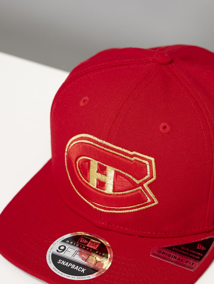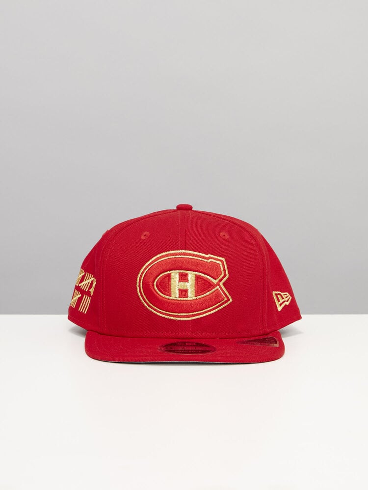 Red & metallic gold Canadiens cap with a straight visor and the iconic Montreal Canadiens logo embroidered on the front. The classic New Era logo is embroidered on the side. There are other unique characteristics on the hat such as 24 tally marks to represent the 24 Stanley Cup championships and the years of the championships on the bottom of the visor. Finally, it features a snapback adjustment in the back for the perfect fit!