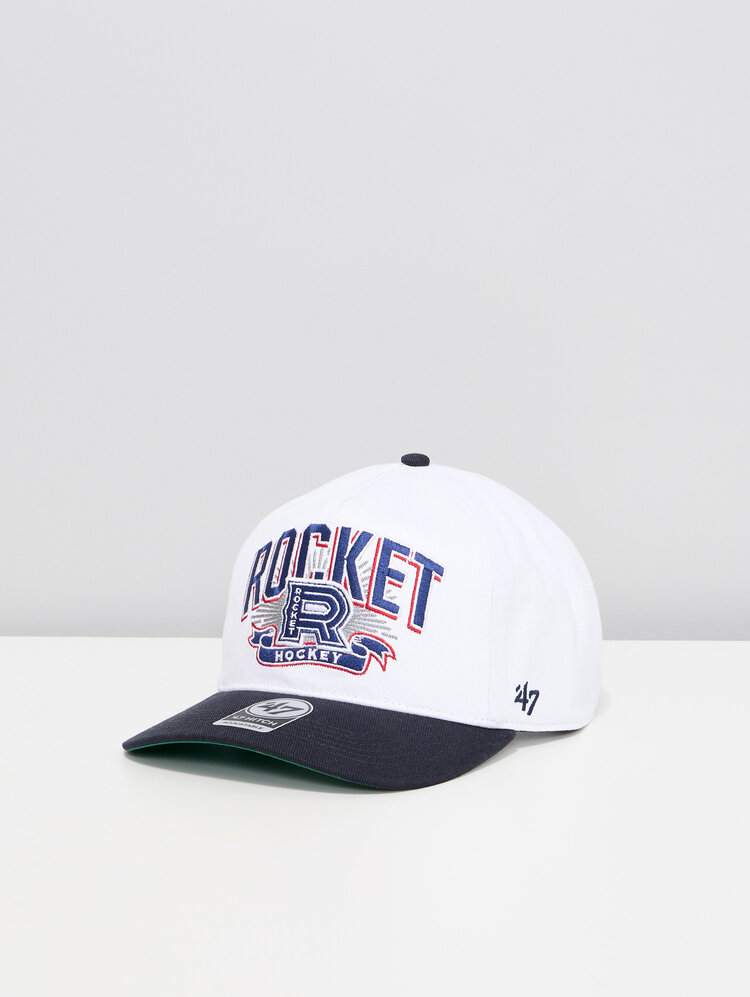 Step up your fan style with the Laval Rocket Prime Play Hitch Snapback Cap. Made from durable heavy twill fabric, this cap features a crisp white crown paired with a navy visor and a classic green undervisor for a timeless look. Its structured shape and adjustable plastic snapback closure ensure a secure and comfortable fit. The front showcases a dynamic embroidered graphic with a mix of raised and flat stitching, highlighted by chain stitch detailing that adds texture and depth. A bold accessory for any Rocket supporter.