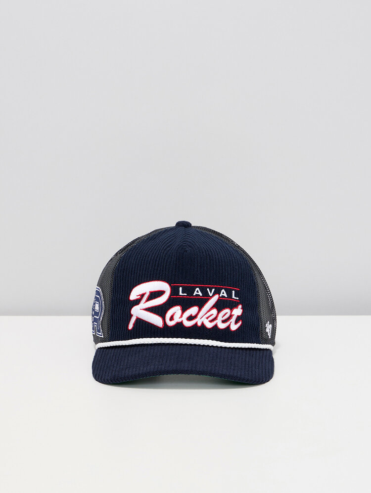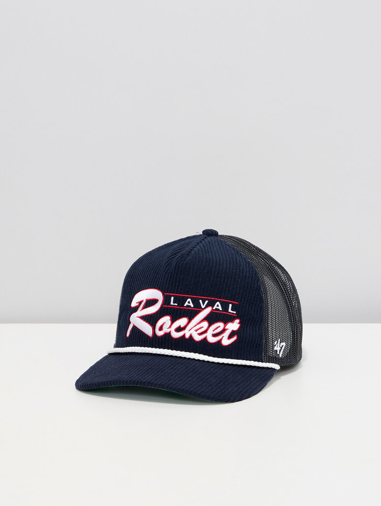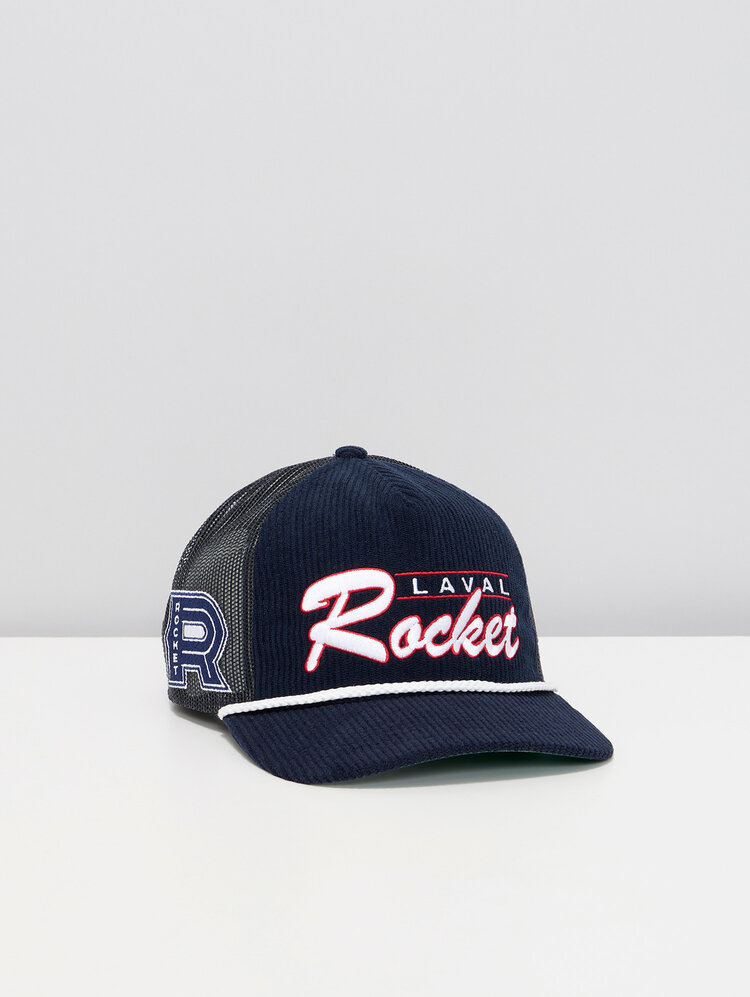 Bring retro flair to your fan gear with the Laval Rocket Double Header Rope Trucker Cap. Featuring an 8W corduroy front and a durable hard mesh back, this cap offers a relaxed fit and breathable comfort. The adjustable plastic snapback closure ensures a secure and customizable fit. A raised embroidered graphic on the front boldly displays “Laval Rocket” while the side features a flat embroidered team logo. Finished with a braided rope detail across the front panel, this cap blends vintage style with modern fan pride.