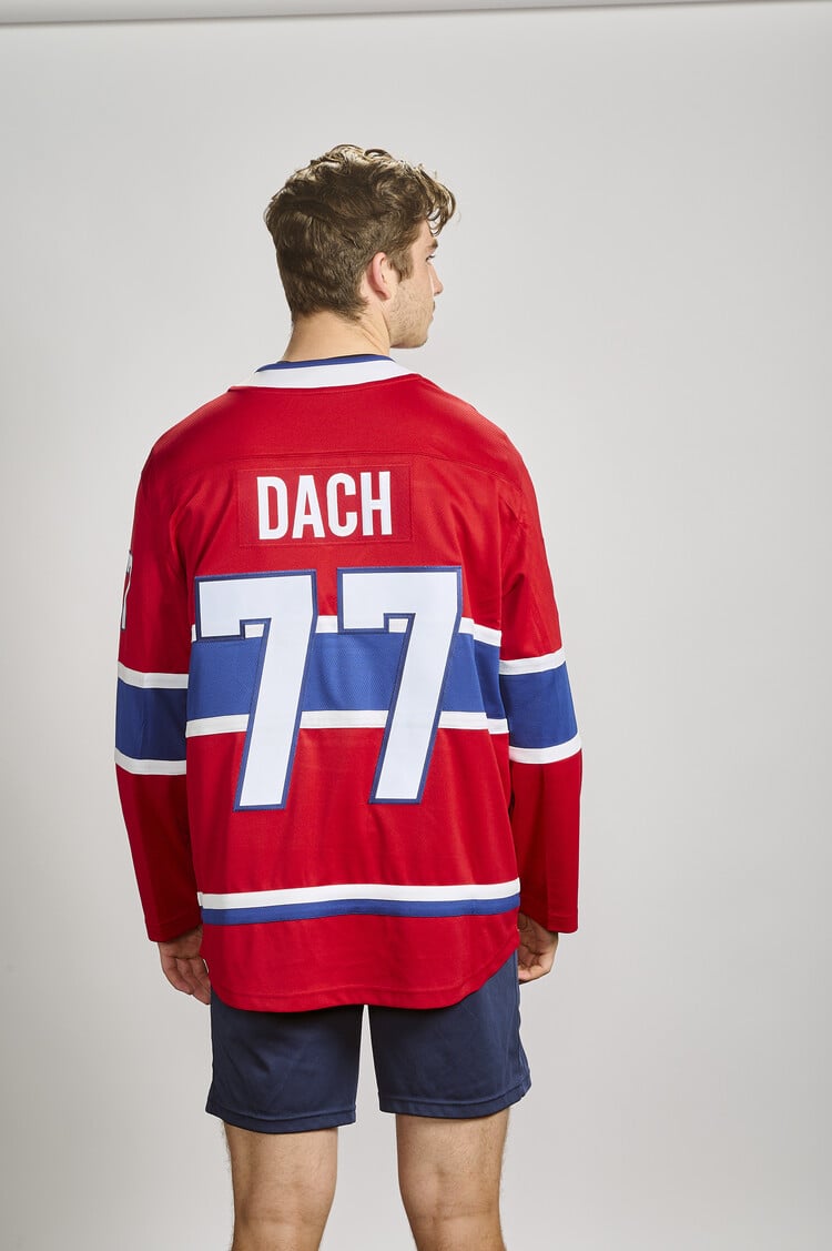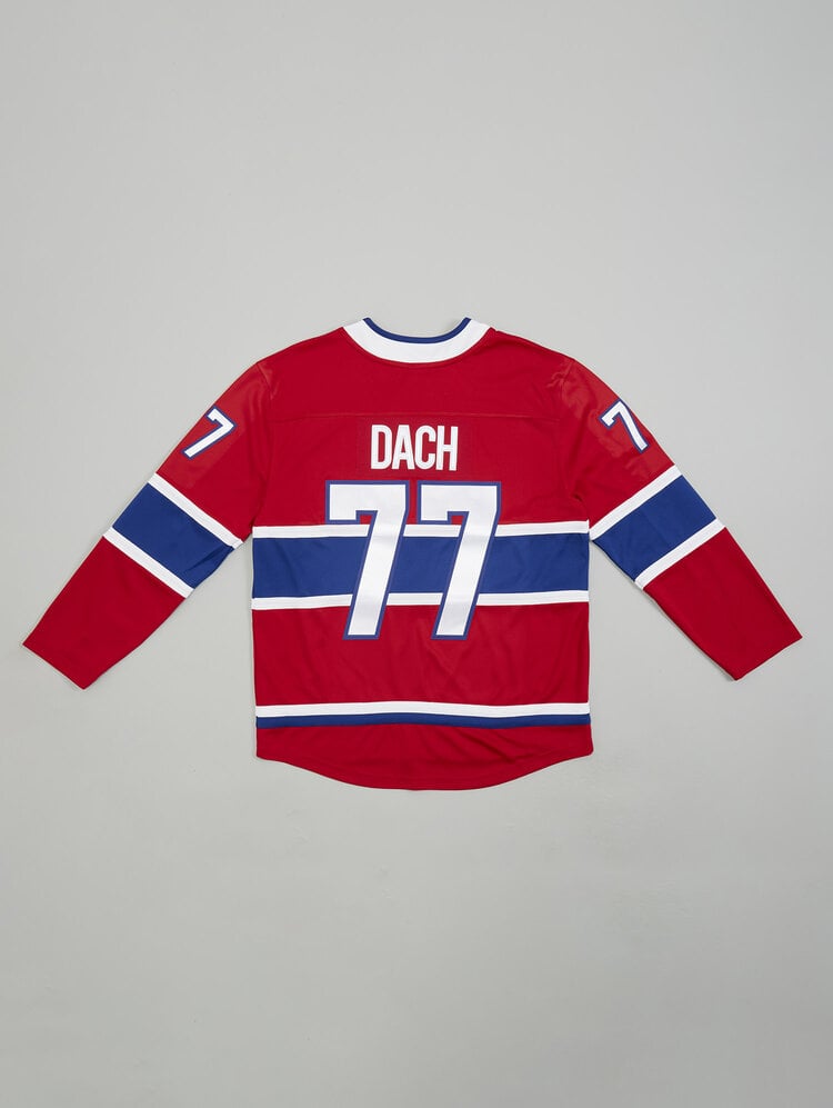 Made from durable, breathable polyester, this jersey is built for comfort, whether you’re watching the game at the arena or representing your team wherever you go. The front proudly displays the Montreal Canadiens’ signature "CH" logo, meticulously heat-sealed at the center, while the sleeves and shoulders feature bold blue and white stripes that highlight the team's traditional color scheme. Dach's name and number (#77) are prominently displayed on the back in large, tackle-twill letters and numbers, showcasing your support for one of the Canadiens' most promising players.
