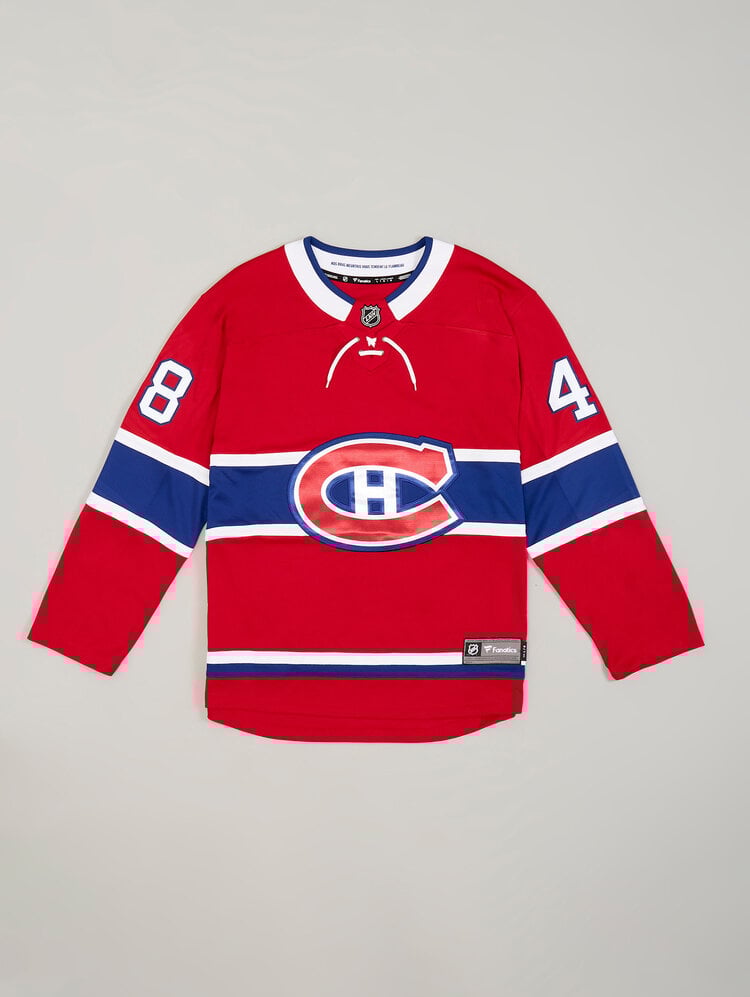 Made from durable, breathable polyester, this jersey is built for comfort, whether you’re watching the game at the arena or representing your team wherever you go. The front proudly displays the Montreal Canadiens’ signature "CH" logo, meticulously heat-sealed at the center, while the sleeves and shoulders feature bold blue and white stripes that highlight the team's traditional color scheme. Hutson's name and number (#48) are prominently displayed on the back in large, tackle-twill letters and numbers, showcasing your support for one of hockey’s best young players.