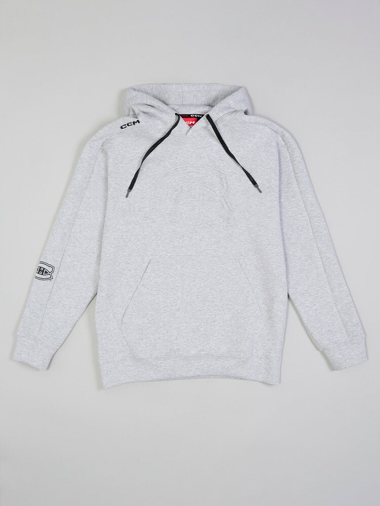 Elevate your fan gear with the Montreal Canadiens Grey Debossed Pullover Hoodie by CCM—a perfect blend of subtle style and everyday comfort. This unisex hoodie in light grey features a debossed Montreal Canadiens logo on the front, offering a refined and understated look. The drawstring hood provides adjustable coverage, while ribbed cuffs and hem ensure a snug, cozy fit. An embroidered patch on the sleeve adds a premium touch to this high-quality piece, making it a standout addition to any Canadiens collection.