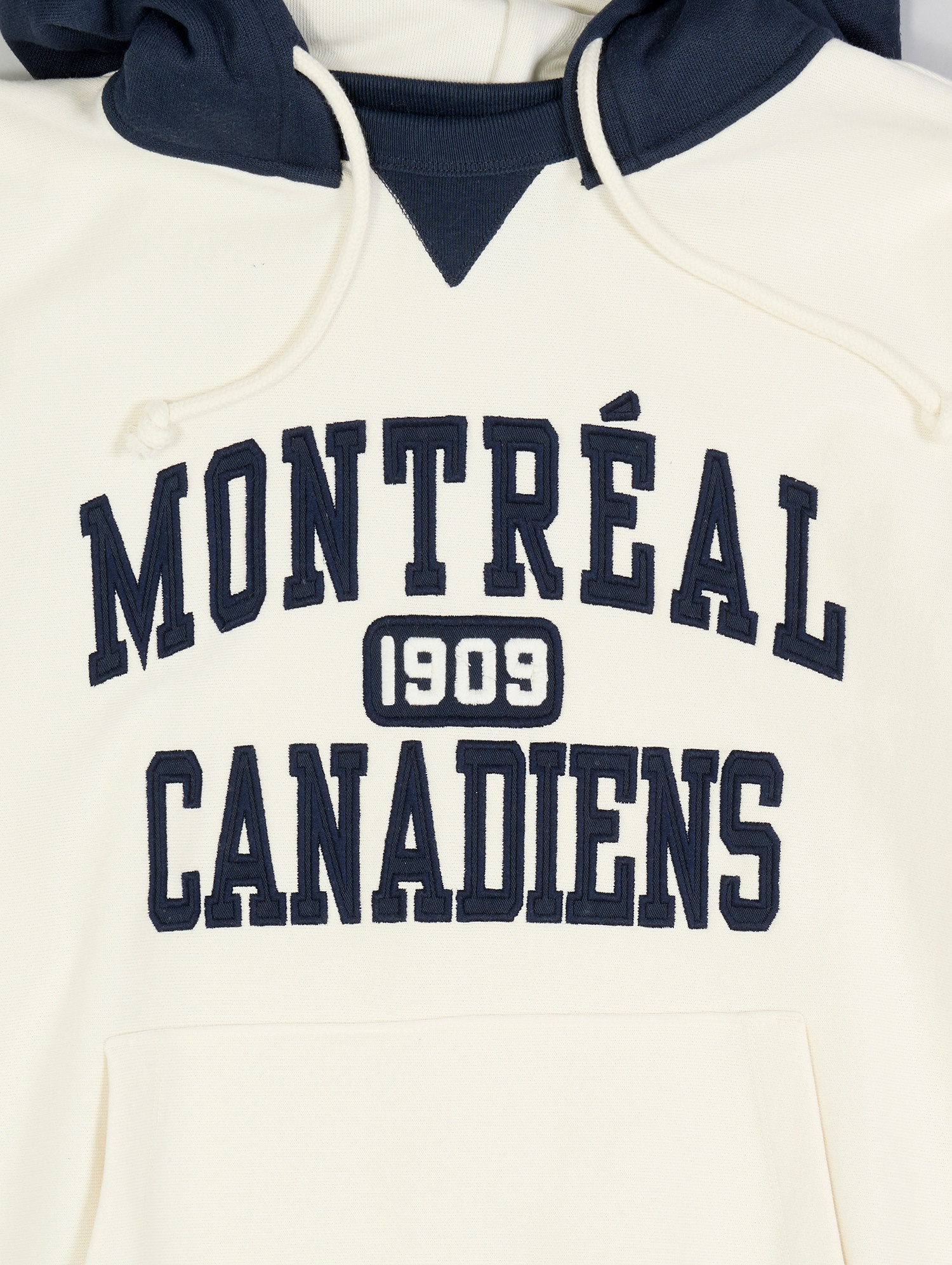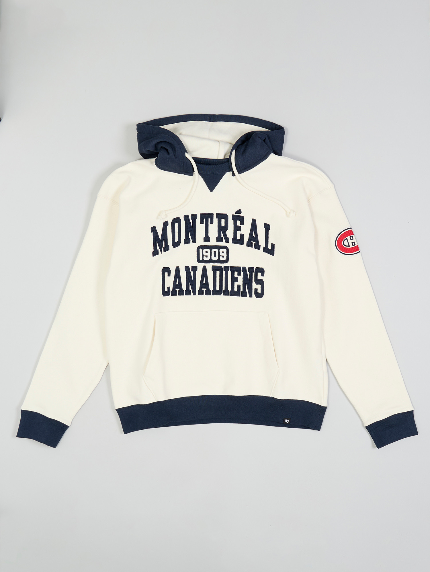 Celebrate timeless Habs style with the Montreal Canadiens Golden Age Pullover Hoodie by ’47 Brand. Crafted from soft tanker fleece for lasting comfort, this hoodie features bold finished cotton twill graphics across the chest for a vintage-inspired look. Its sandstone body with contrast team color details adds a classic touch that stands out on game day or any casual outing. A perfect blend of heritage design and everyday wearability, this hoodie is a must-have for every Canadiens fan.