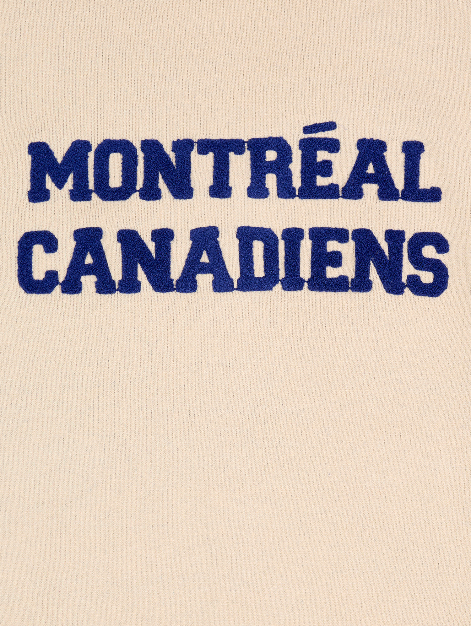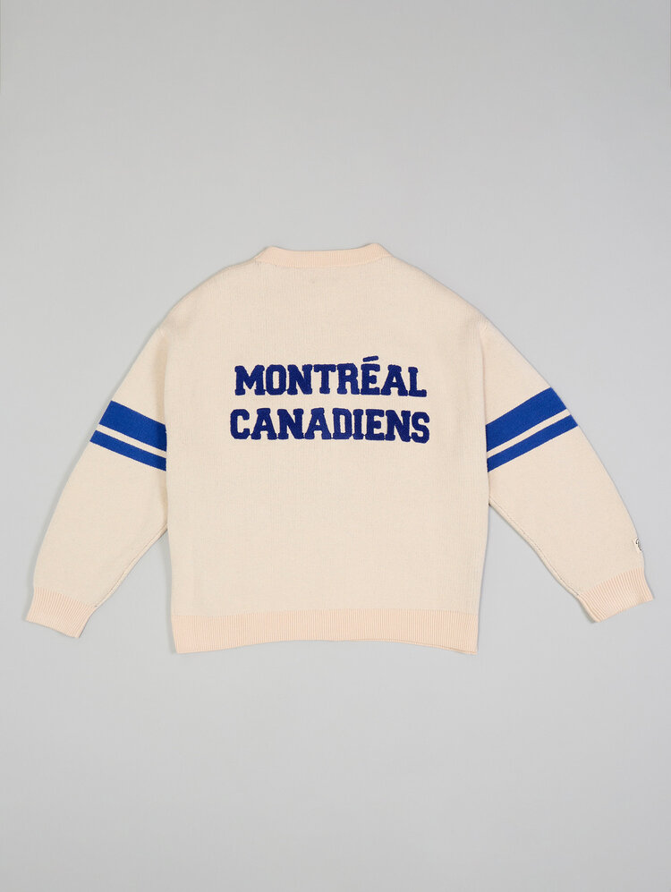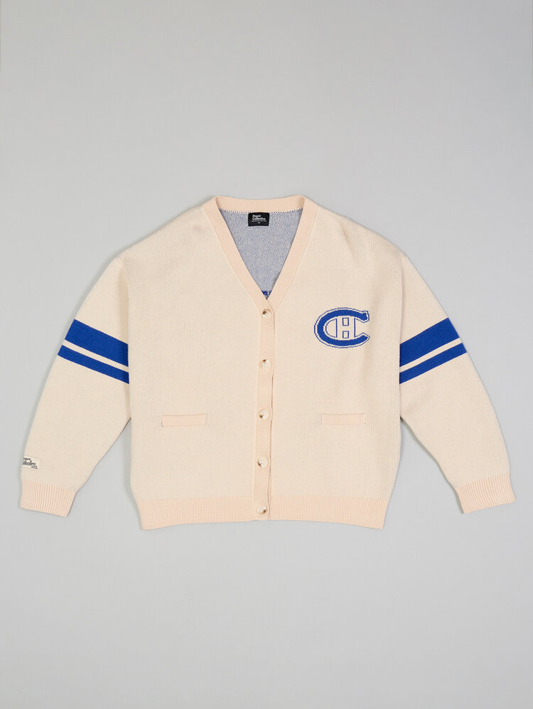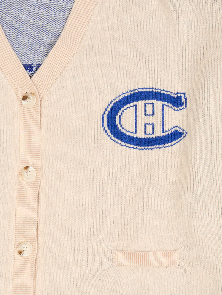 Add timeless style to your fan wardrobe with the Montreal Canadiens Classic Logo Knit Cardigan. This beige cardigan features bold blue accents, including sleeve stripes and ribbed detailing, for a vintage-inspired look. The iconic Canadiens logo is embroidered on the left chest, showcasing your team pride with subtle sophistication. Designed with a V-neck and button-down front, this knit cardigan offers warmth, comfort, and versatility — perfect for layering on game days or casual outings. Two front pockets add function to fashion, making it a must-have for any Canadiens supporter.