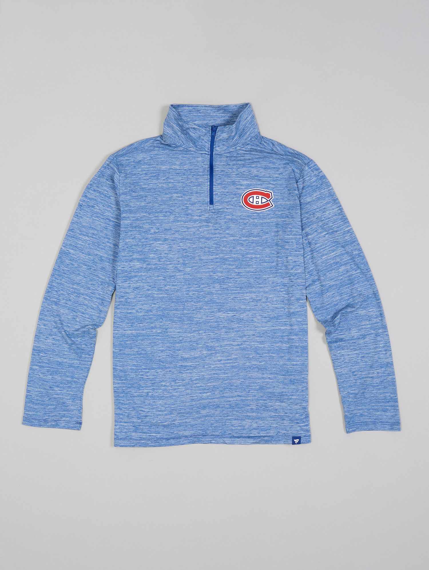 Stay warm and stylish while showing off your team pride with the Montreal Canadiens Royal Blue Clutch Quarter Zip. Designed for comfort and performance, this pullover features a sleek silicone transfer of the Canadiens logo on the chest and a woven label sewn for added authenticity. Made from a lightweight 165gsm heathered fabric blend of 93% CD Polyester and 7% Spandex, it offers a soft, stretchy fit that moves with you. The quarter zip design adds versatility, making it perfect for layering on game day or casual outings. With its modern royal blue heathered finish, this piece is a must-have for any dedicated fan.