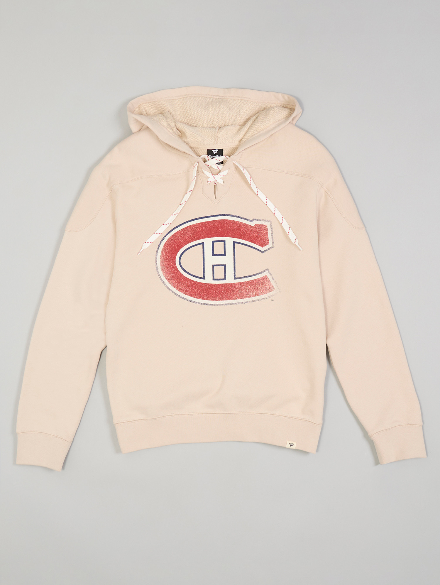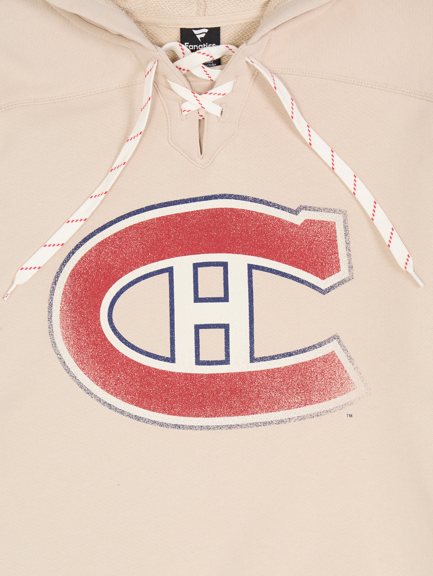 Show off your Canadiens pride with this Montreal Canadiens Vintage Hoodie in a stylish Brazilian Sand Heather color. Crafted from 360gsm 100% cotton knit loose terry, this hoodie delivers premium comfort and durability. Featuring a waterbase print logo and a woven label sewn for authenticity, it combines a timeless design with modern quality. The lace-up neckline adds a retro hockey-inspired touch, making it the perfect piece for game day or casual wear.