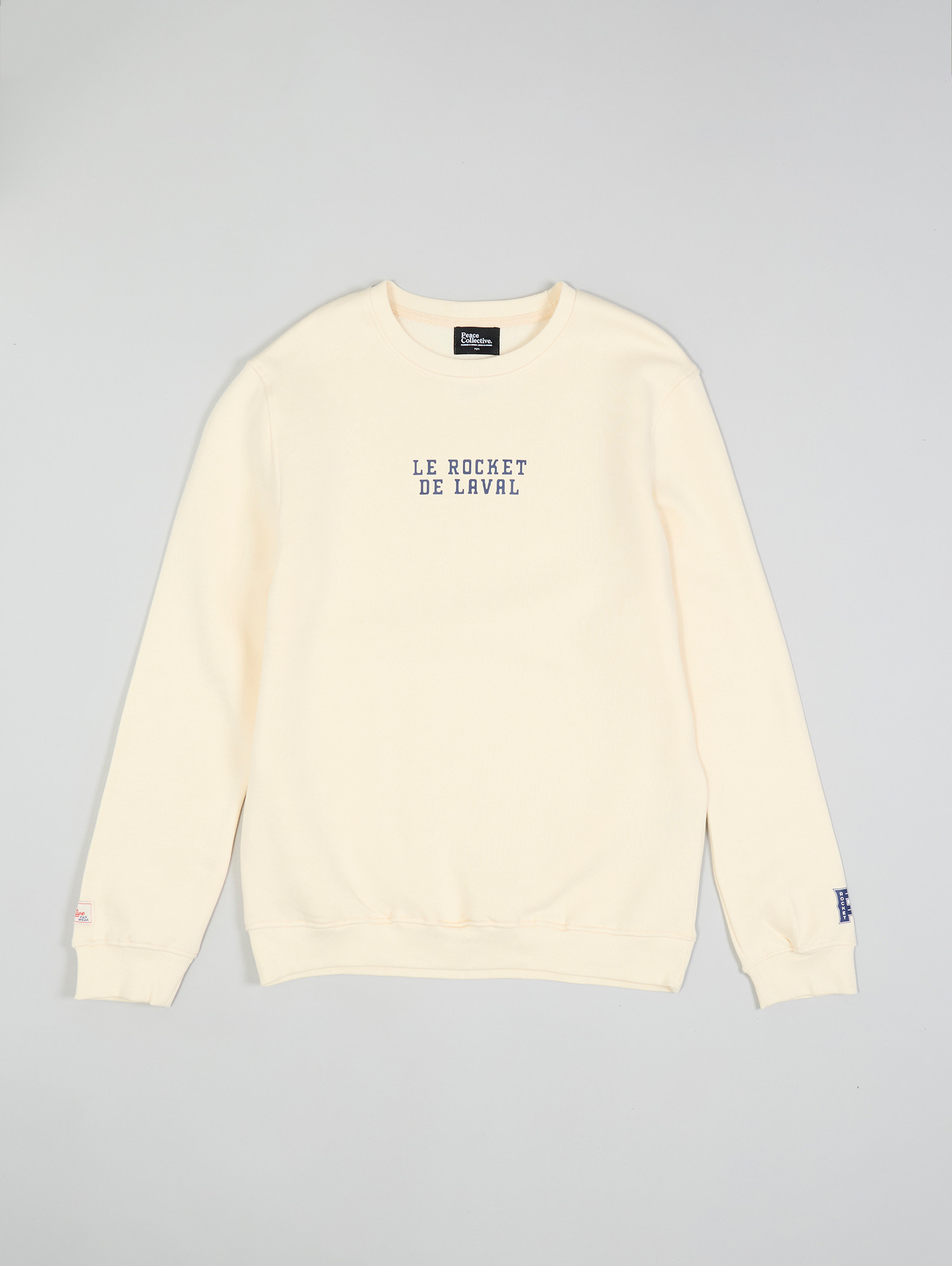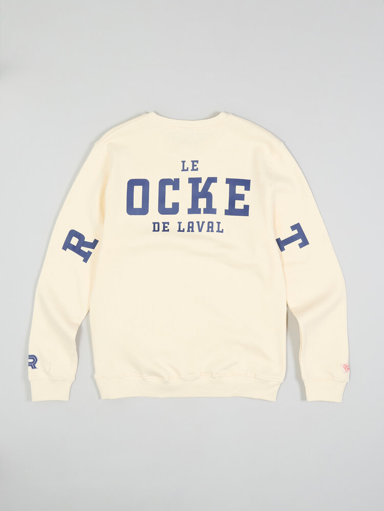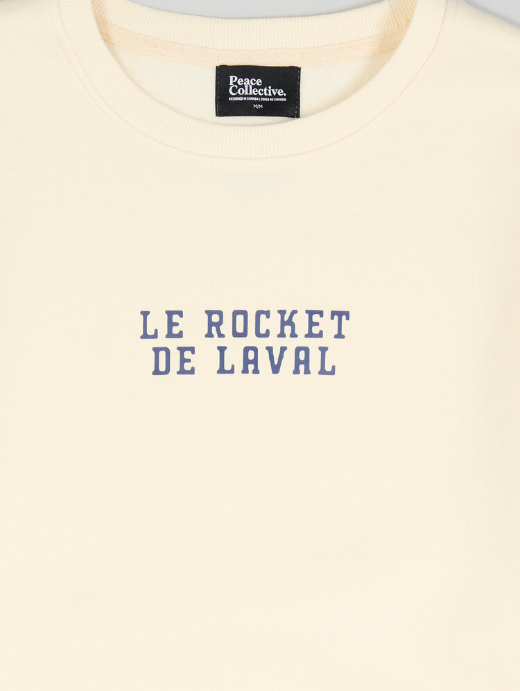 Show your Rocket pride in bold, modern style with the Laval Rocket Spirit Crewneck in Beige by Peace Collective. This officially licensed AHL piece features detailed graphics on the front and sleeves, giving it a distinctive streetwear edge. Constructed from a soft 60% cotton, 40% polyester ringspun fleece, it's designed for comfort and durability. Ribbed at the collar, cuffs, and hem for a snug fit, and preshrunk to minimize shrinkage, this crewneck blends everyday wearability with passionate fan energy.