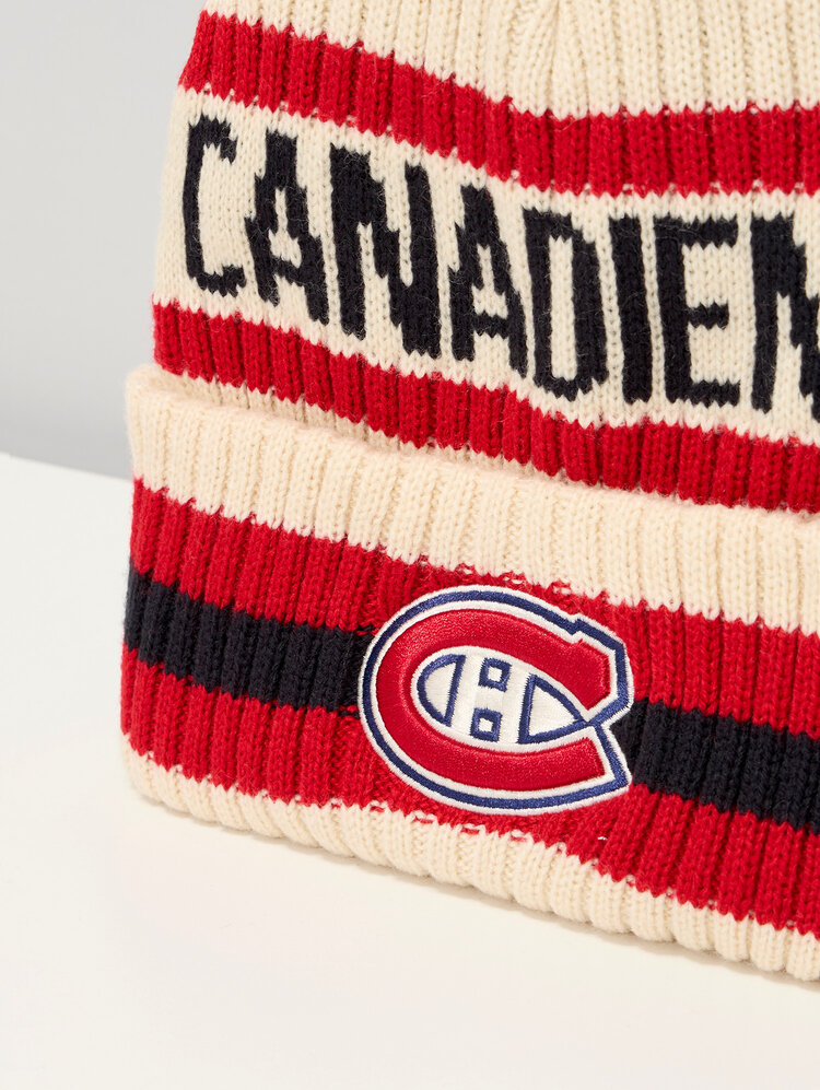 Gear up for winter with the Montreal Canadiens Bering Pom Tuque, designed to keep you warm while showing off your team pride. Made from 100% acrylic yarn, this cuff knit tuque features a cozy microfleece lining and a playful pom on top. The bold woven jacquard team name stretches across the front, complemented by contrast stripes in official Canadiens colors. A raised embroidered logo on the cuff adds a finishing touch to this essential cold-weather accessory.