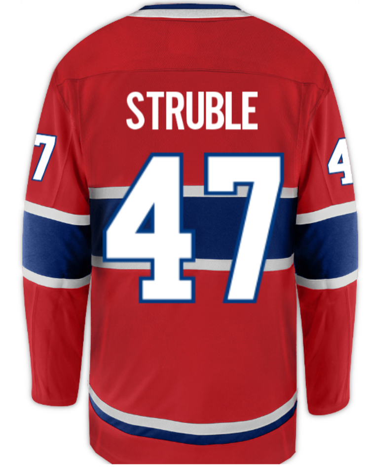 Made from durable, breathable polyester, this jersey is built for comfort, whether you’re watching the game at the arena or representing your team wherever you go. The front proudly displays the Montreal Canadiens’ signature "CH" logo, meticulously heat-sealed at the center, while the sleeves and shoulders feature bold blue and white stripes that highlight the team's traditional color scheme. Struble's name and number (#47) are prominently displayed on the back in large, tackle-twill letters and numbers, showcasing your support for one of hockey’s good young defencemen.