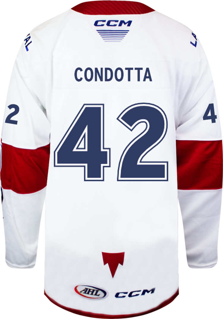 The classic white color, accented with the Rocket’s signature blue and red details, makes a striking statement, while the authentic team crest on the front showcases your pride for Laval’s AHL franchise. Whether you're cheering from the stands or representing your favorite team on the go, this Lucas Condotta Laval Rocket jersey is a must-have for any dedicated fan.