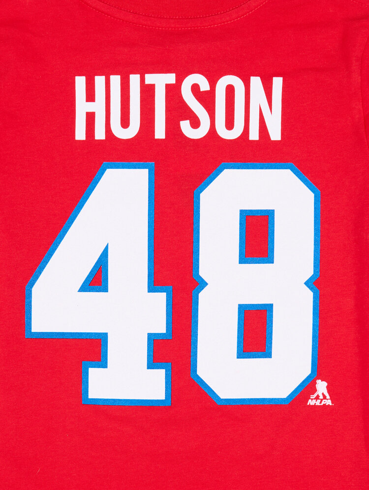 This is the authentic Montreal Canadiens player t-shirt for kids ages 2 to 7 with the name Lane Hutson #48 printed on the back of the t-shirt. A great way to show support for your favorite player!