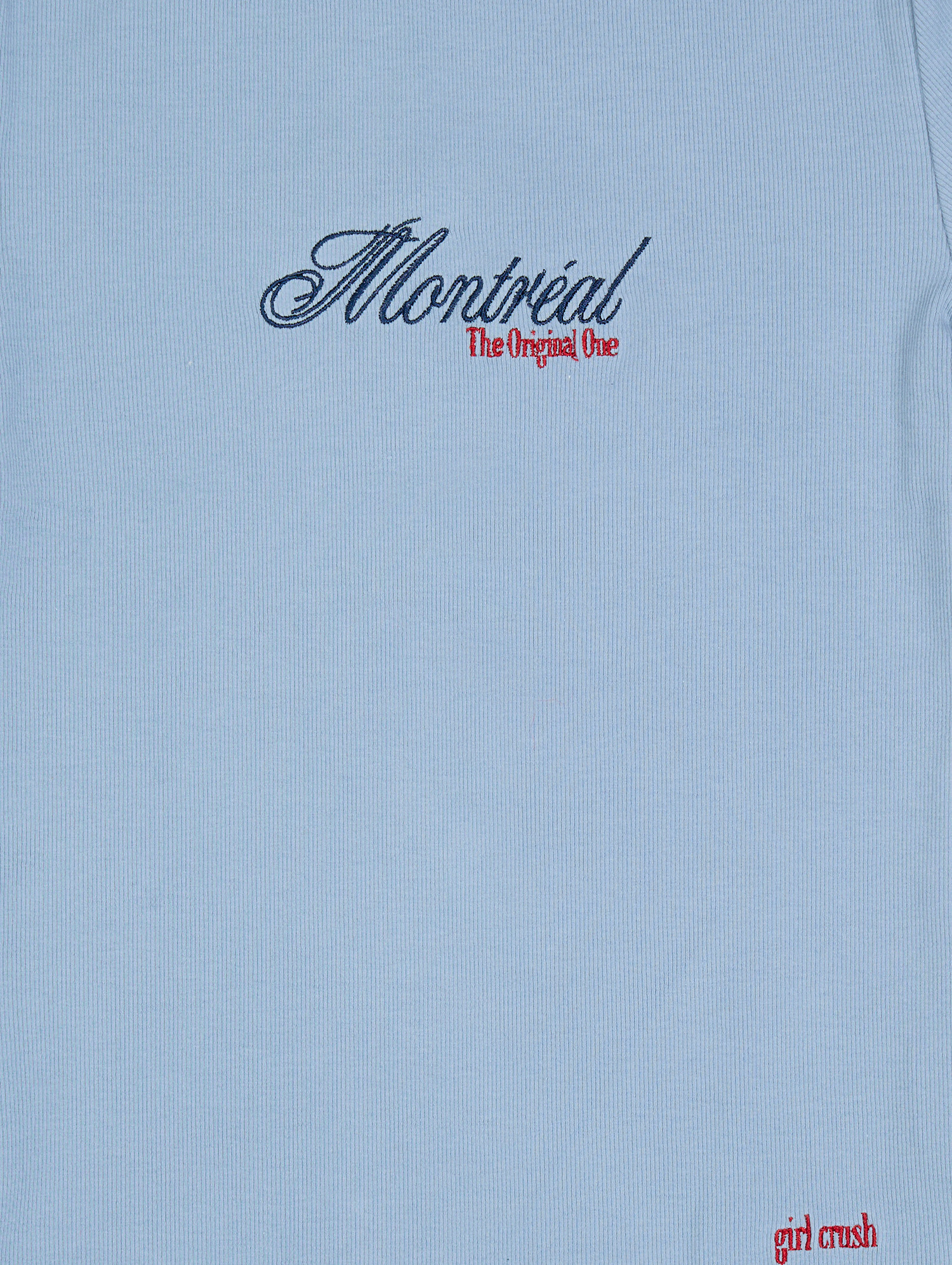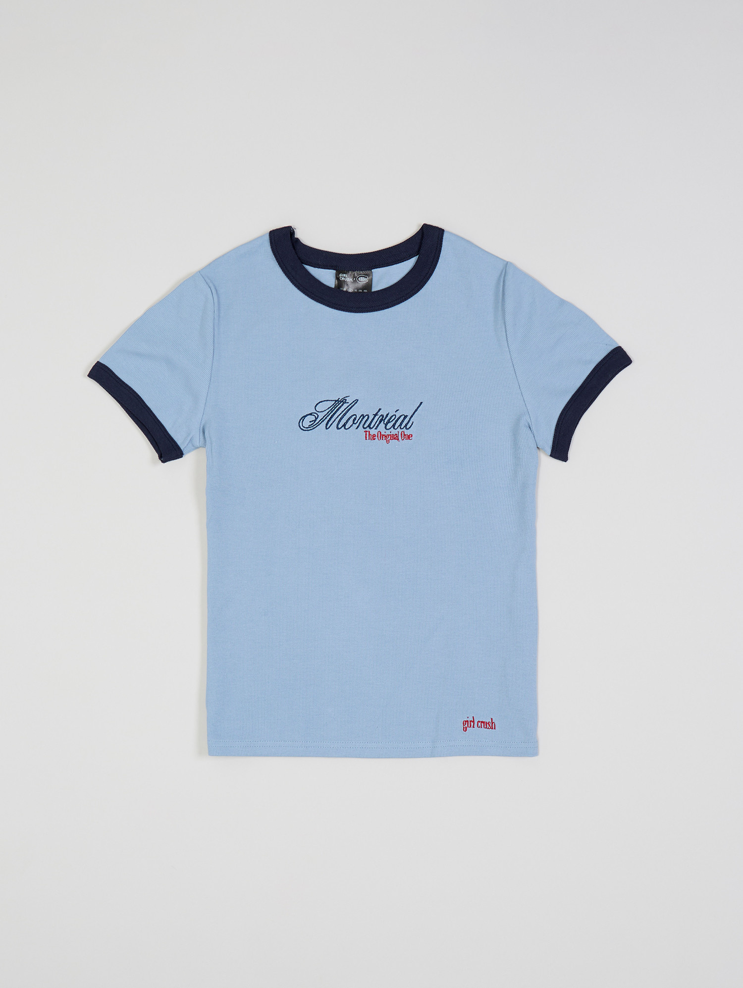 Show your love for Montréal with the GIRL CRUSH x The Original One Montréal Script T-Shirt. This stylish tee features a light blue base with contrasting navy ribbed collar and sleeves, giving it a retro-inspired look. The front showcases an embroidered “Montréal The Original” script in elegant lettering, paired with a subtle Girl Crush detail near the hem for a signature finish.