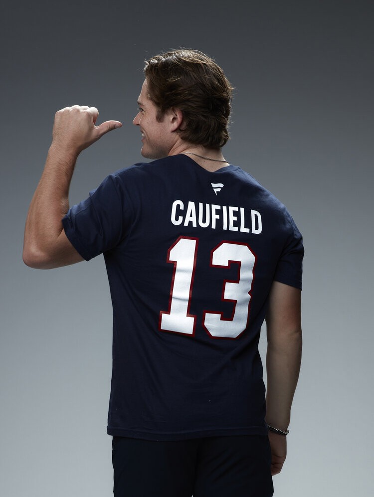 This is the authentic Montreal Canadiens player t-shirt with the name Cole Caufield #13 printed on the back of the t-shirt. A great way to show support for your favorite player!