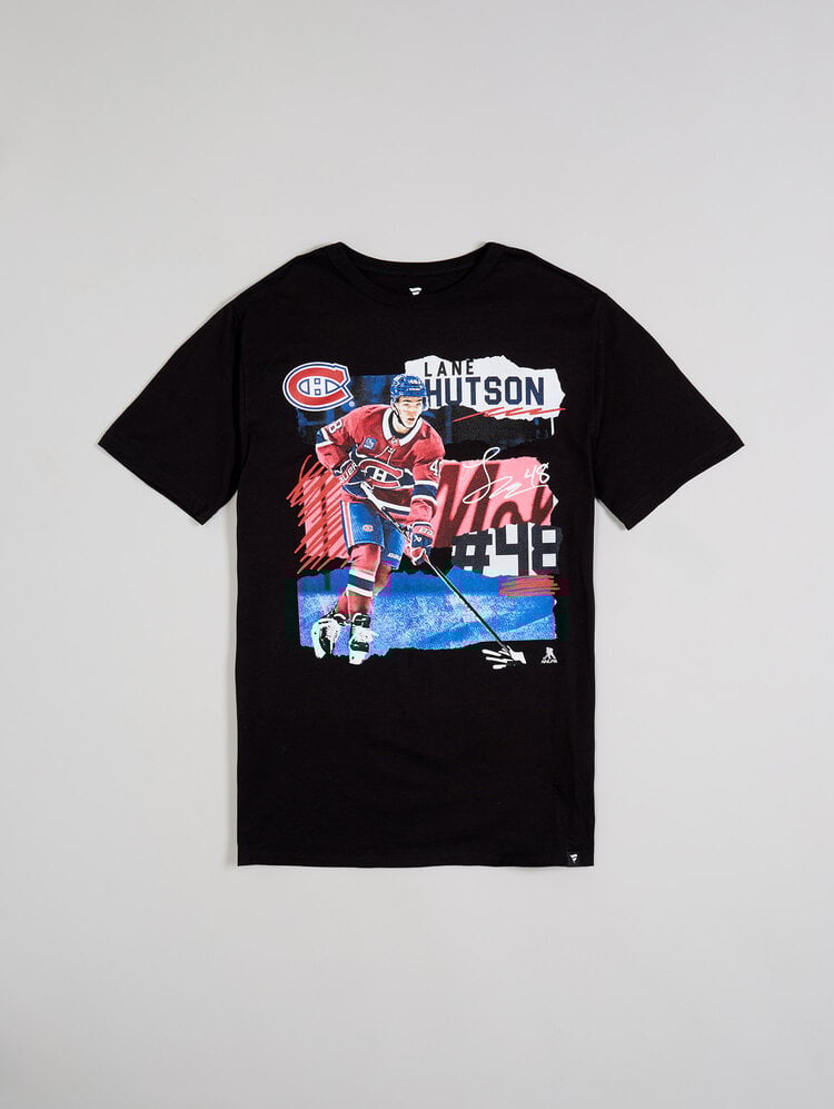 Show your support for one of the most exciting young talents in hockey with the Lane Hutson Young Stars Graphic T‑Shirt. Featuring a dynamic full‑color action graphic of Lane Hutson in his Montreal Canadiens uniform, this bold black tee captures the energy and promise of a rising star.
