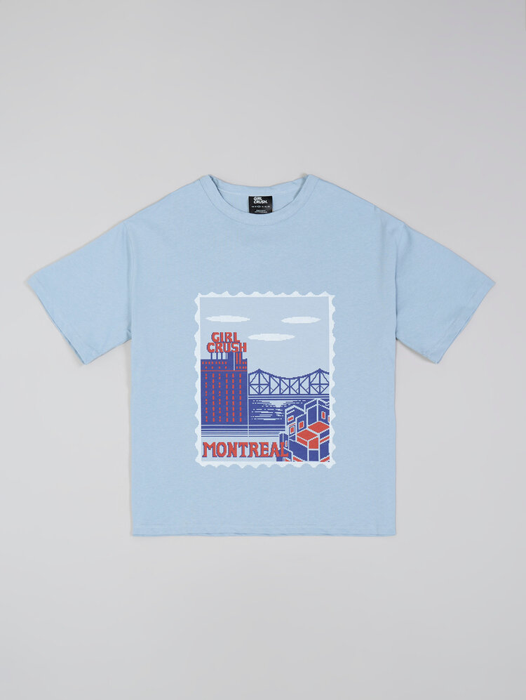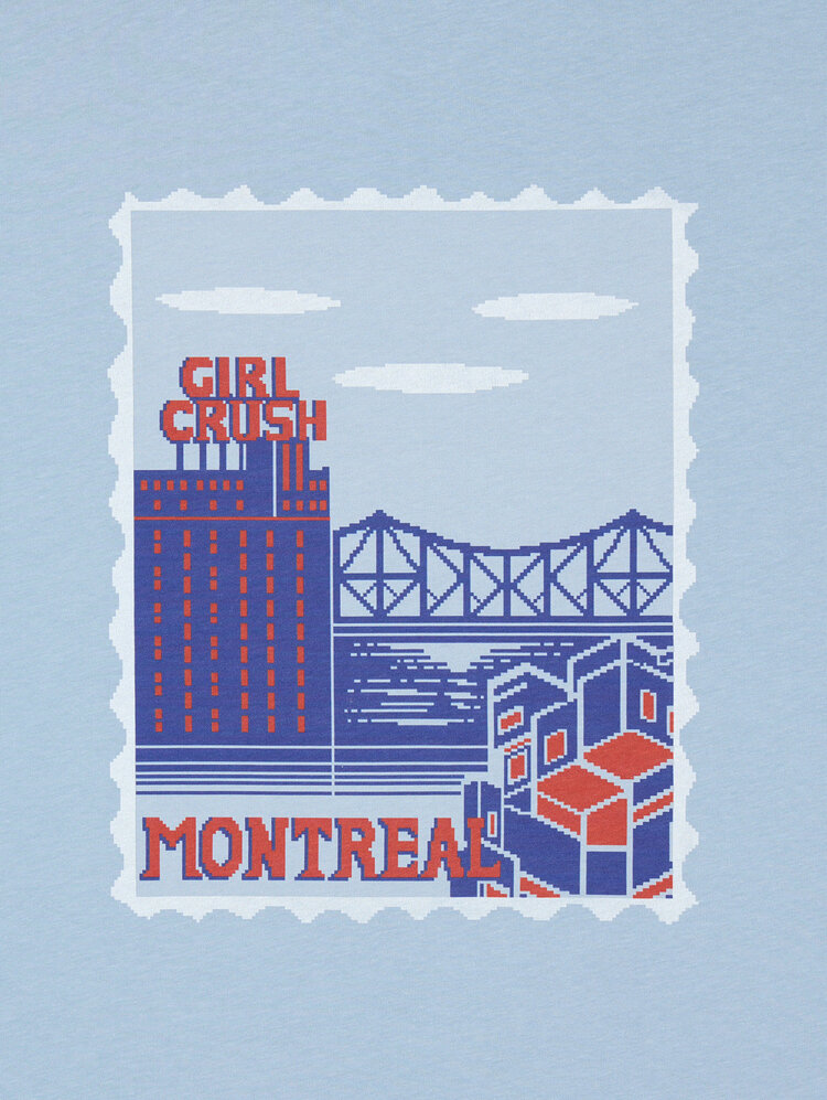 The "Au Quai" tee is a nostalgic nod to Montréal’s vibrant waterfront and architectural charm, wrapped in a soft, sky-blue cotton canvas. This exclusive collaboration between MONTRÉAL and GIRL CRUSH brings together retro aesthetics and local pride in a design that feels both timeless and playful. The front graphic, styled like a vintage postage stamp, features a dreamy cityscape complete with iconic buildings, a bridge, and drifting clouds — all rendered in a palette of bold reds and blues.