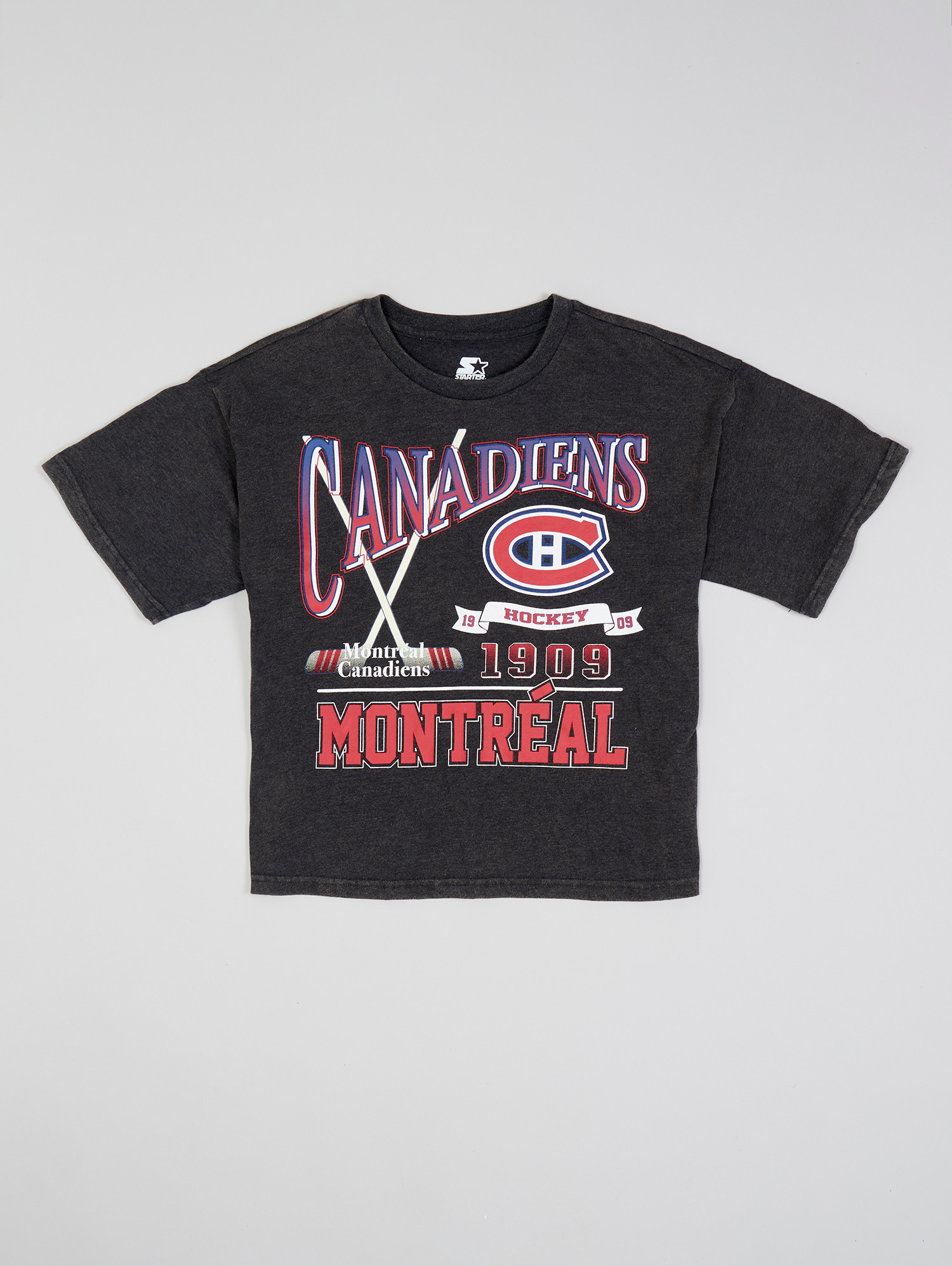 60% cotton, 40% polyester heather jersey with heavy garment washing. Oversize fit crew neck crop length. Vintage graphic tee inspired screen print at full front with embroidered Starter logo