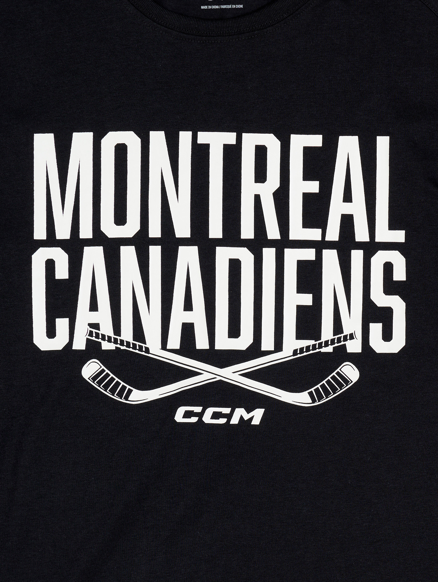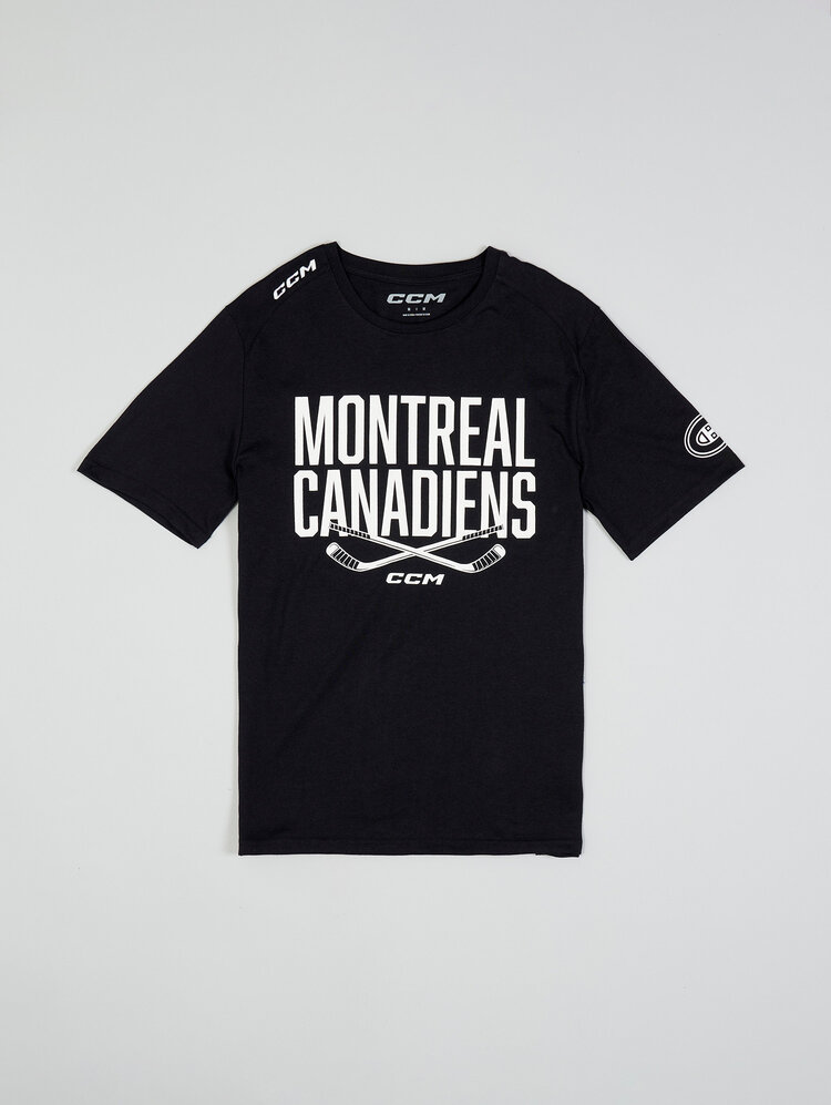 Show your team pride with the Montreal Canadiens Crossed Sticks Graphic T-Shirt by CCM—a bold and comfortable staple for any fan. This black short-sleeve tee features a striking screen-printed design with the "Montreal Canadiens" name in large white block letters, paired with two crossed hockey sticks that highlight the sport’s legacy. Made from high-quality materials, this shirt offers lasting comfort and durability, making it perfect for game days, casual outings, or everyday wear.
