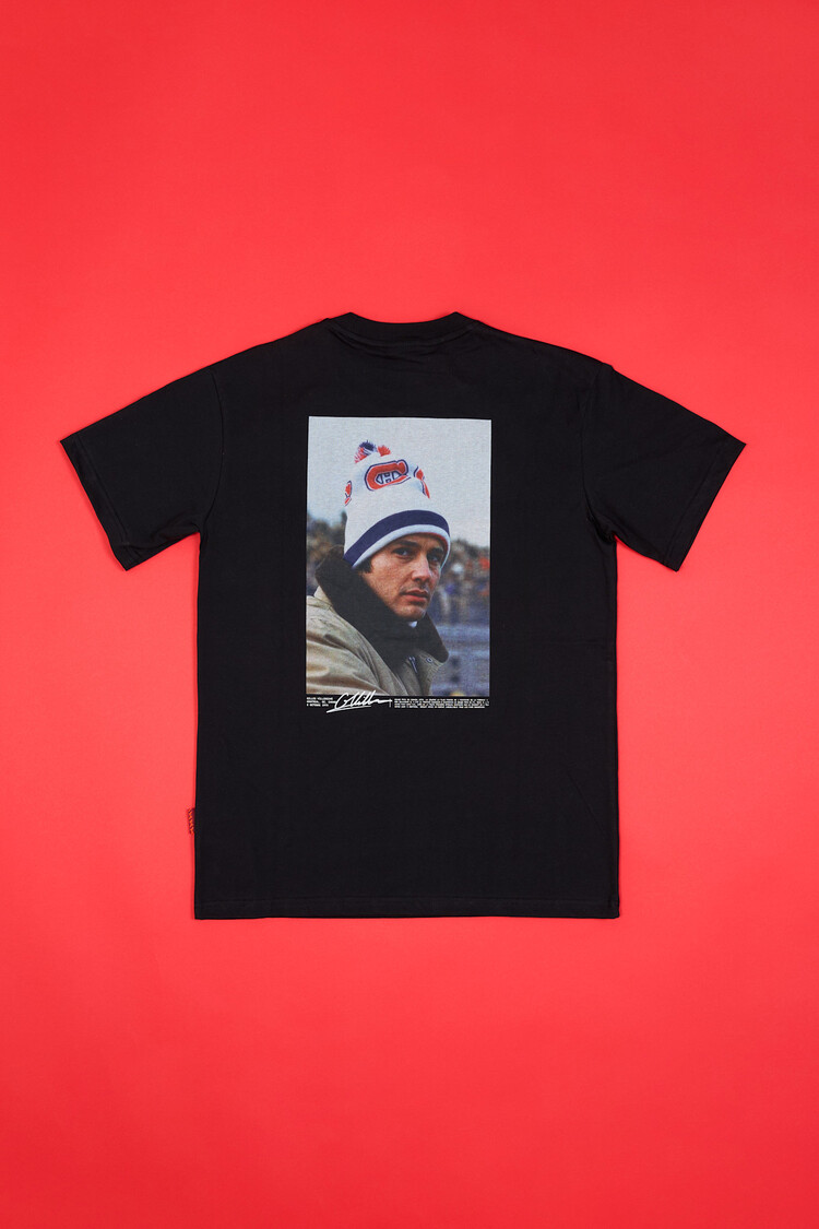 Printed on a premium black tee, the design features a classic photograph of Villeneuve wearing his iconic Canadiens tuque, blending motorsport history with Montreal hockey pride. The high-quality screen print delivers sharp detail and lasting durability, making it a must-have for collectors, racing fans, and devoted Habs supporters alike.